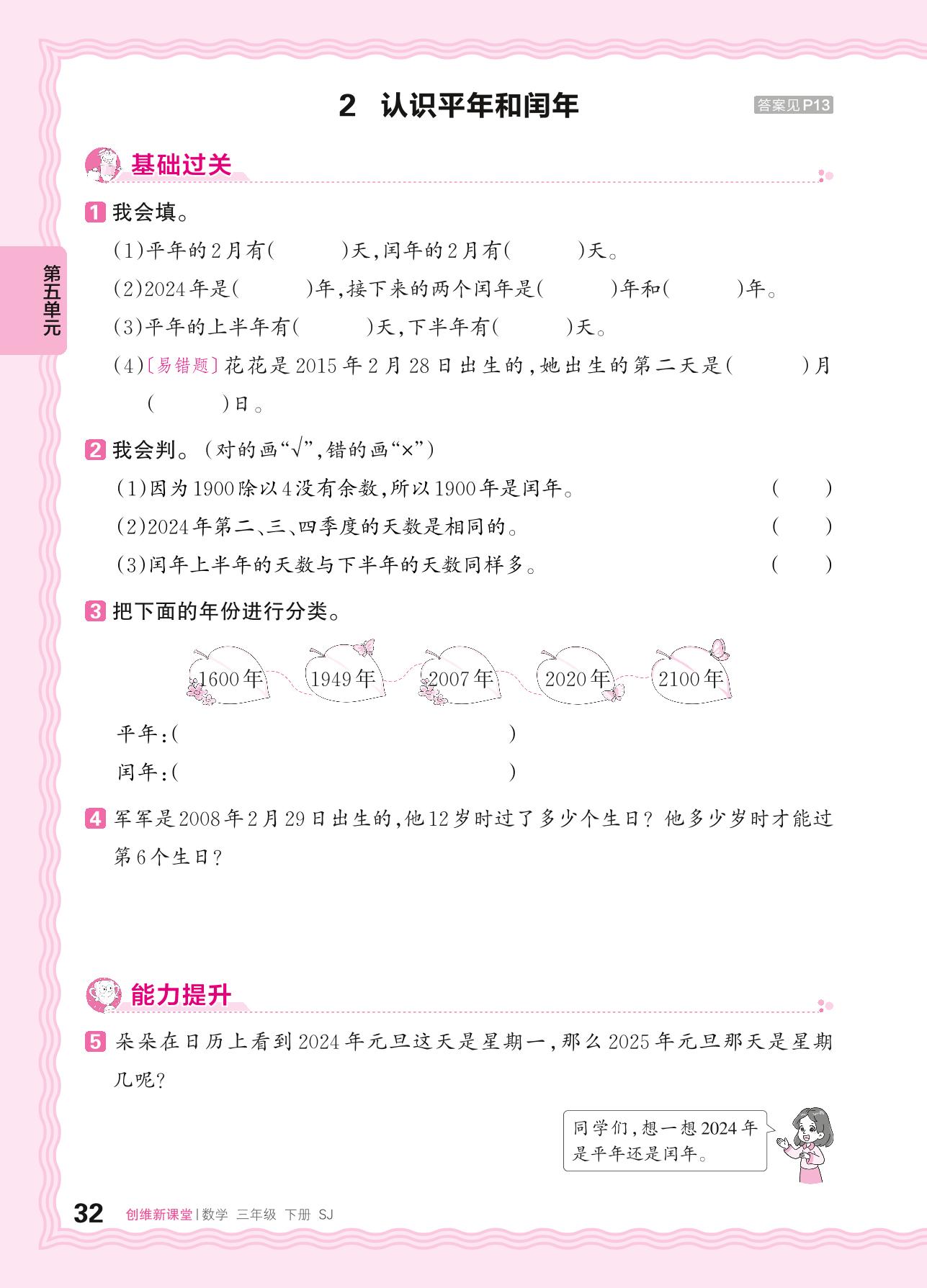 2024春下册三年级数学苏教版 第五单元 年、月、日——2. 认识平年和闰年_R240124091811670
