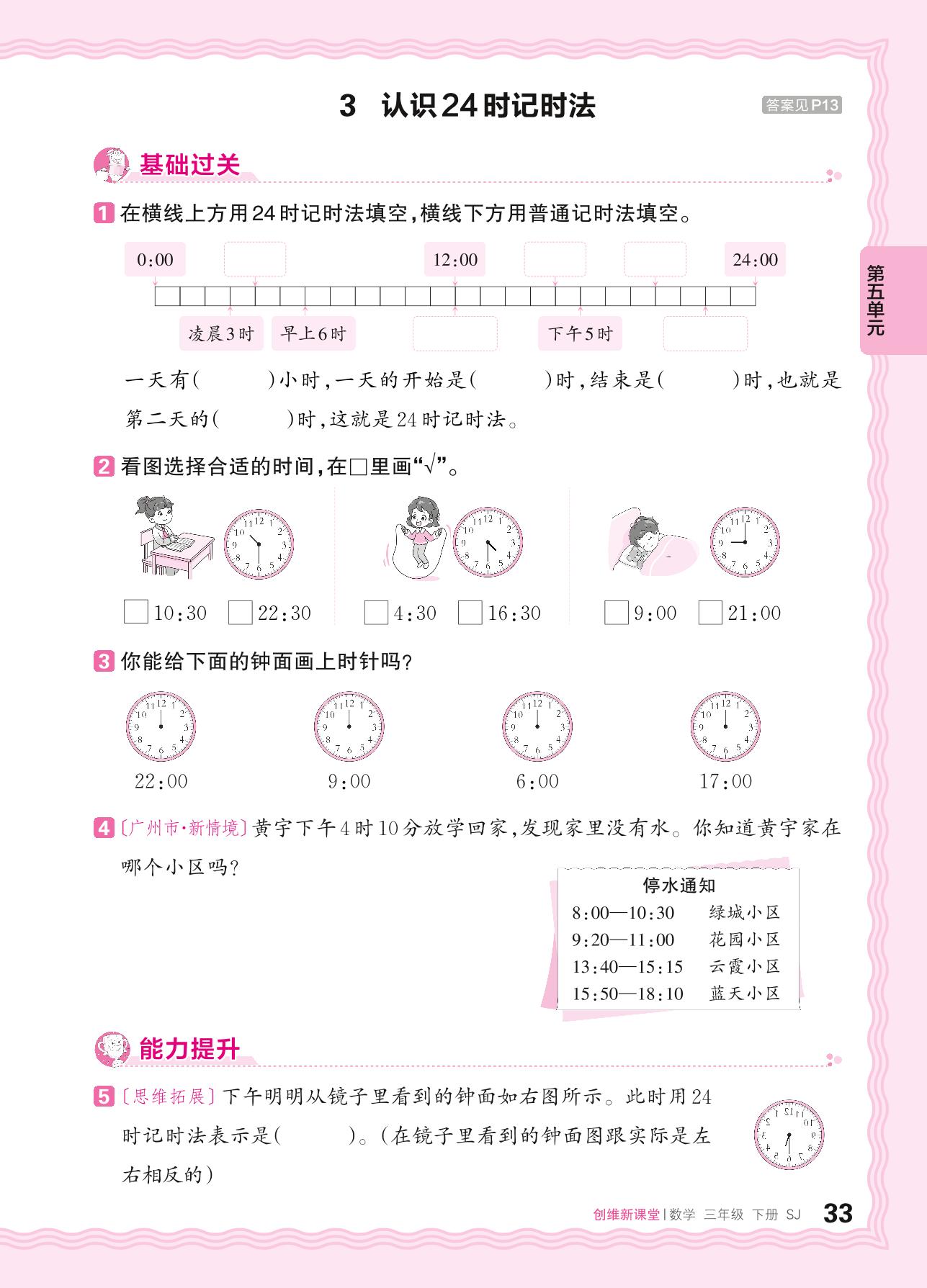 2024春下册三年级数学苏教版 第五单元 年、月、日——3. 认识24时记时法