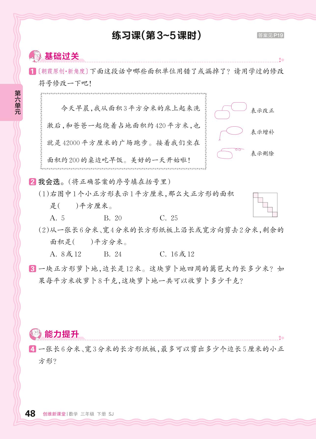2024春下册三年级数学苏教版 第六单元 长方形和正方形的面积——面积的计算、面积单位间的进率练习课