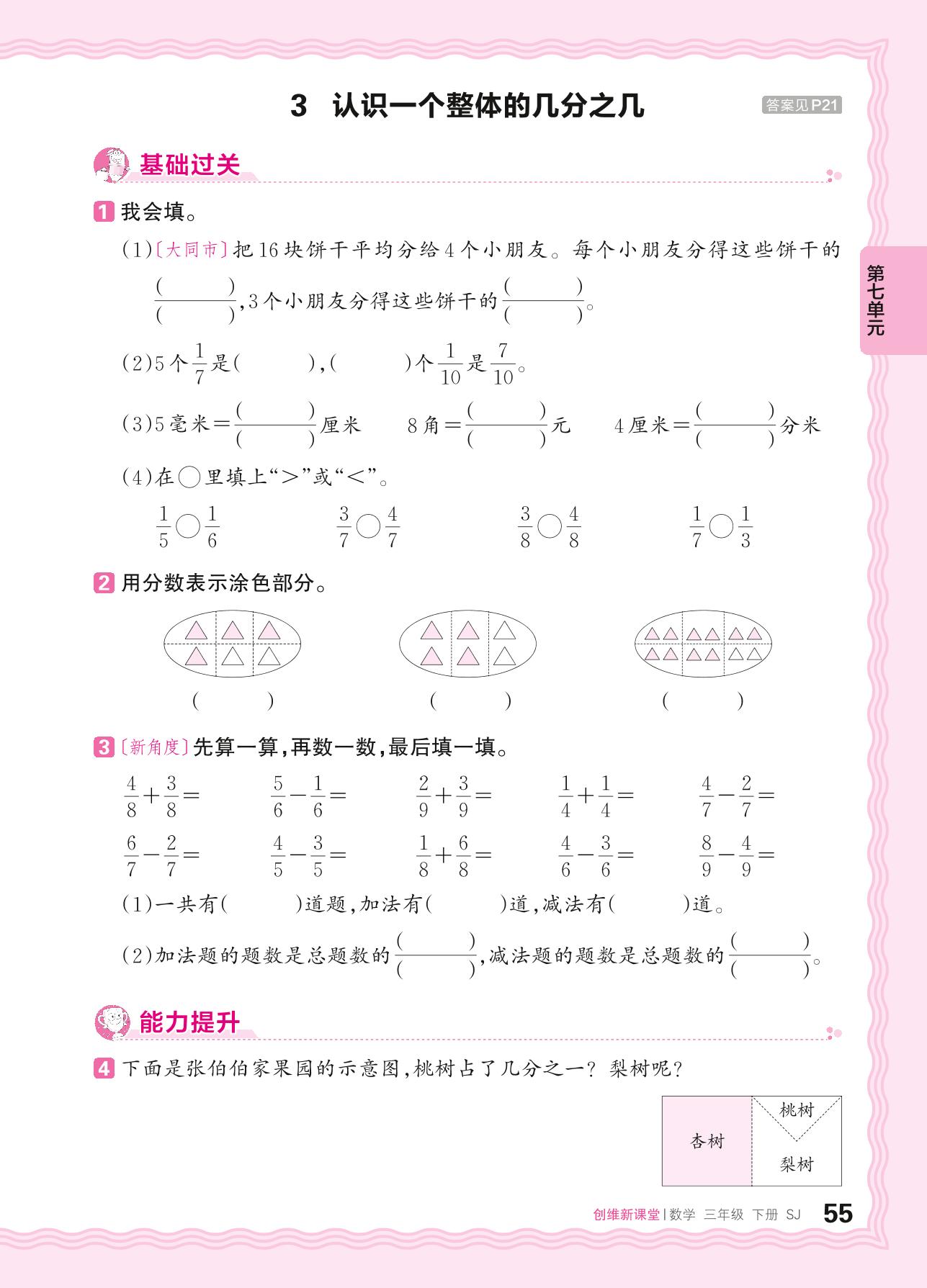 2024春下册三年级数学苏教版 第七单元 分数的初步认识(二)——3. 认识一个整体的几分之几(1)_R240124091818185