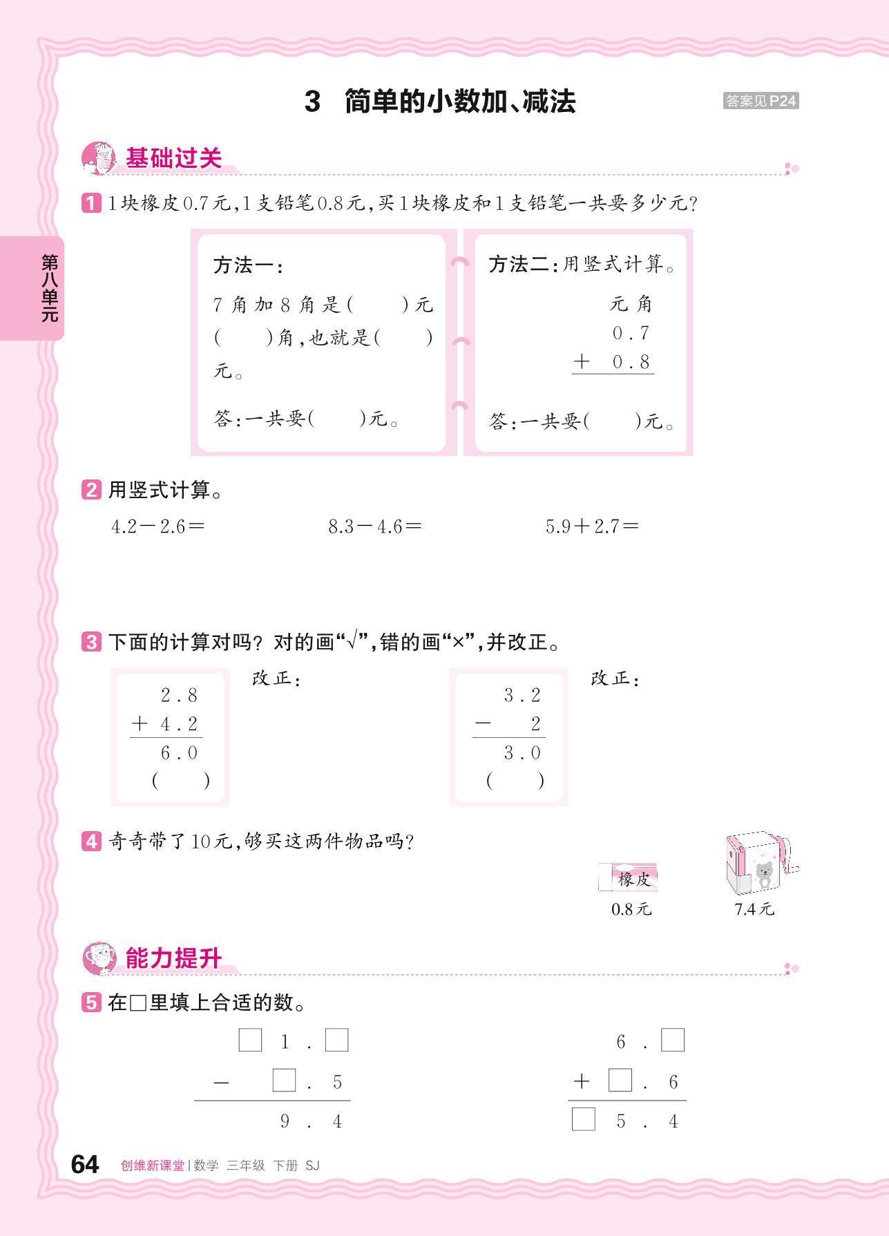 2024春下册三年级数学苏教版 第八单元 小数的初步认识——3. 简单的小数加、减法_R240124091820084