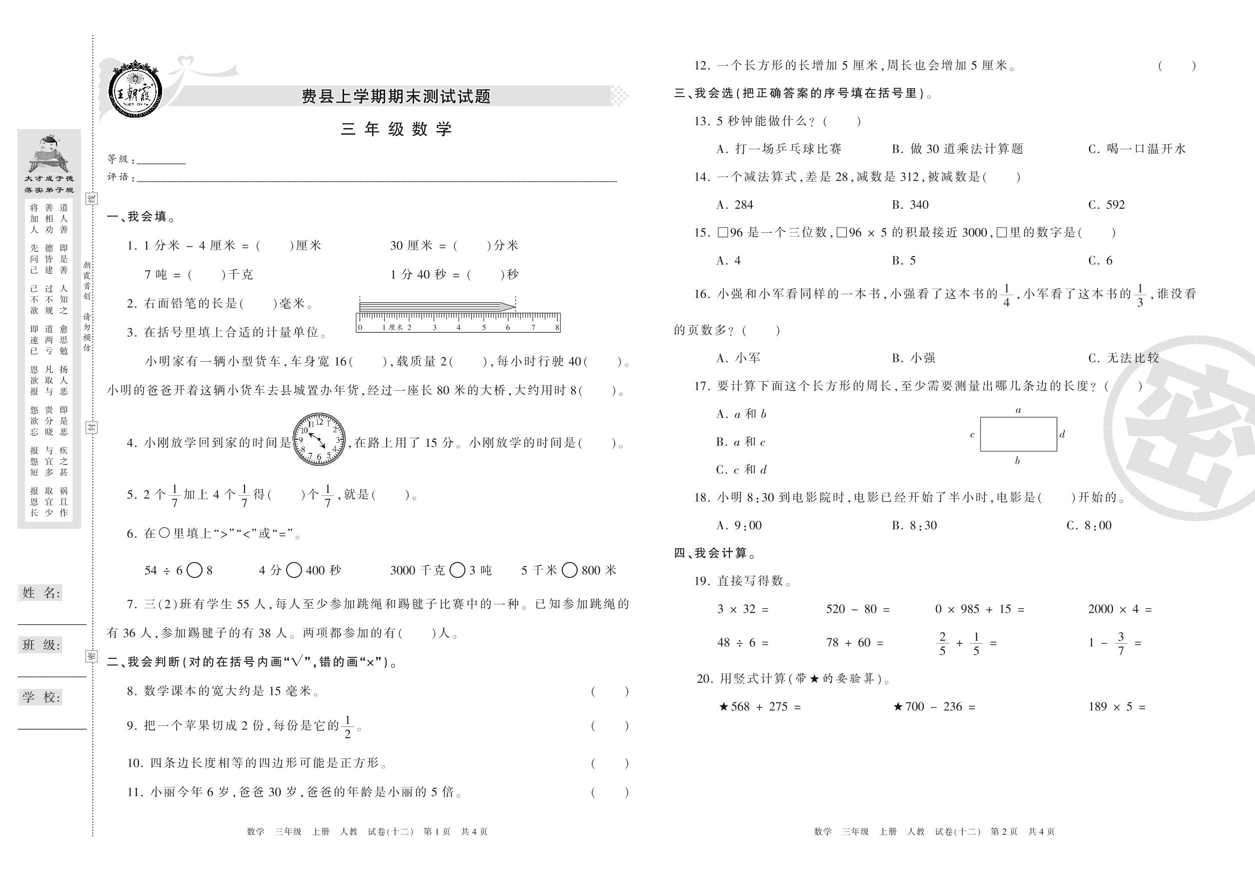 三年级数学人教版上册期末卷