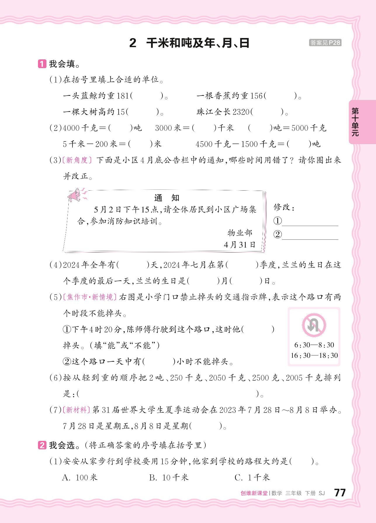 2024春下册三年级数学苏教版 第十单元 期末复习——2. 千米和吨及年、月、日