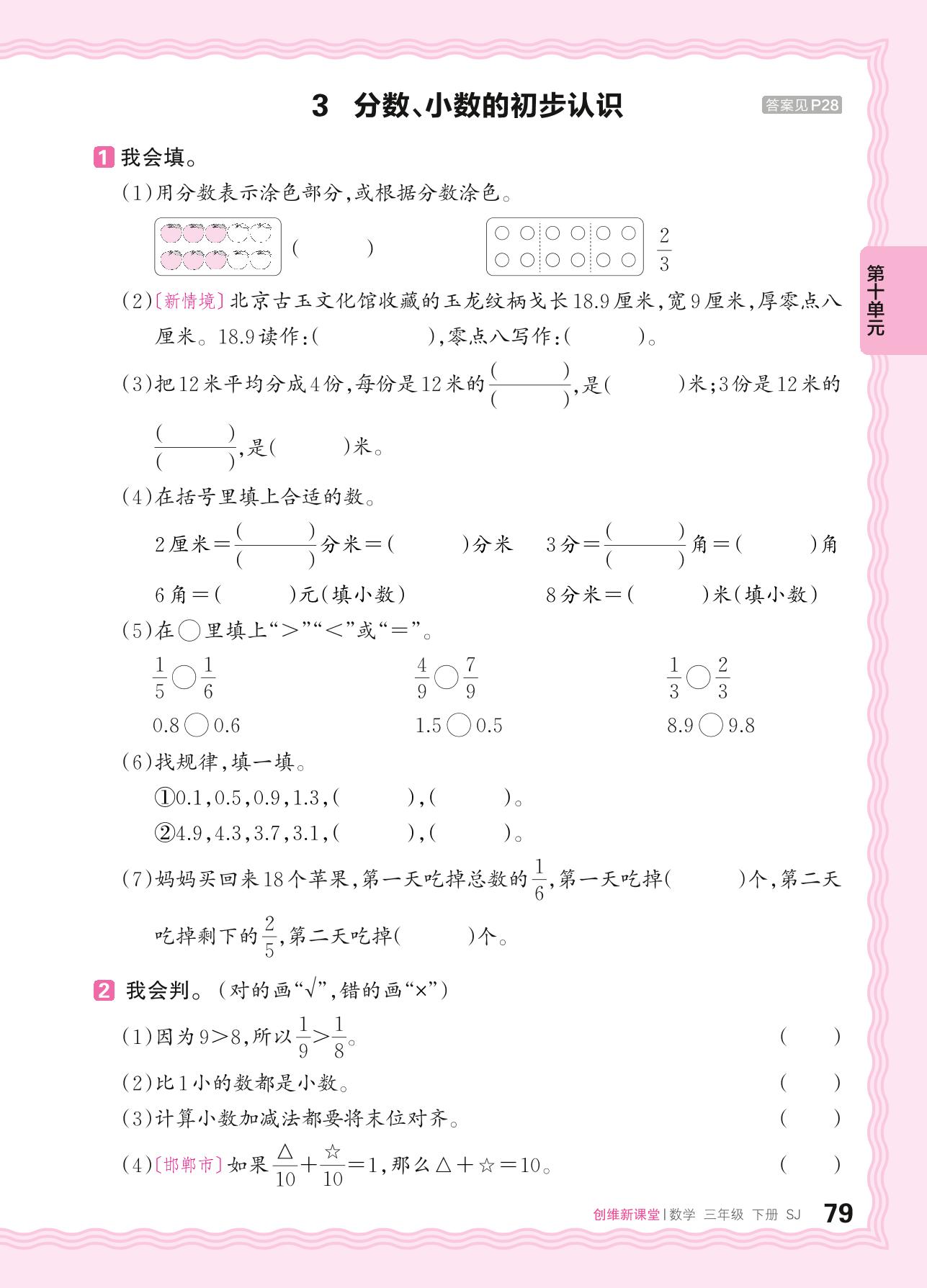 2024春下册三年级数学苏教版 第十单元 期末复习——3. 分数、小数的初步认识