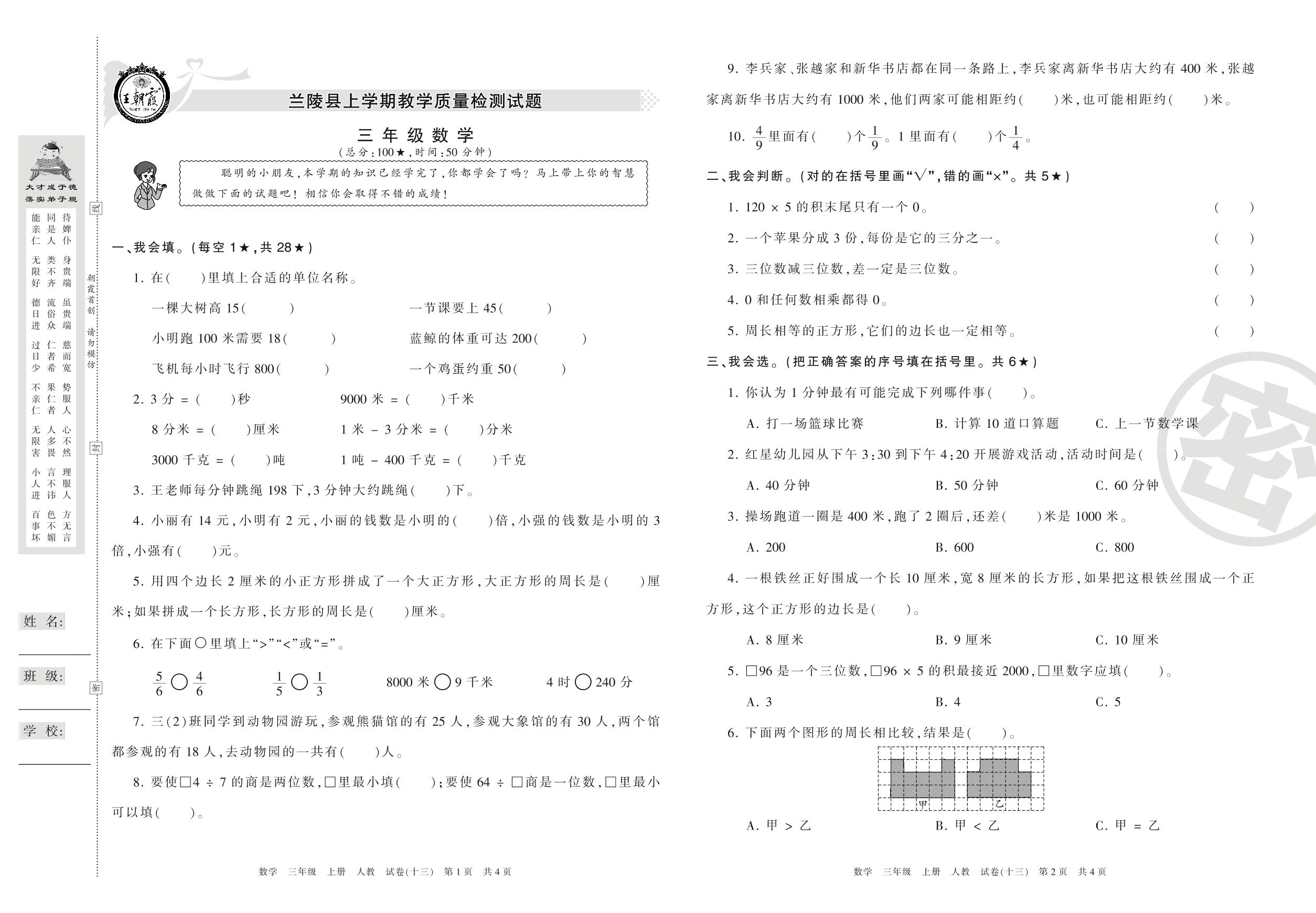 2016-2017学年第一学期临沂市兰陵县三年级数学试卷(人教版)【13】