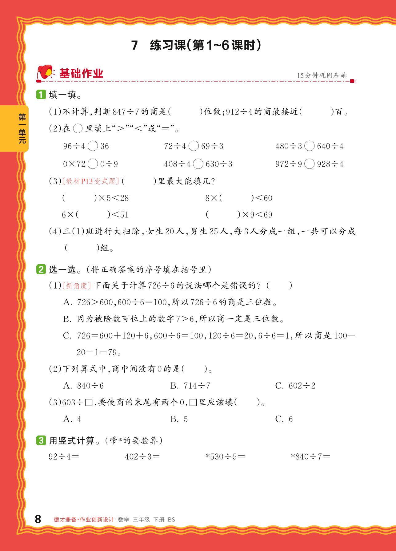 2024春下册三年级数学北师版 第一单元 除法——分桃子、分橘子、商是几位数、猴子的烦恼、节约练习课