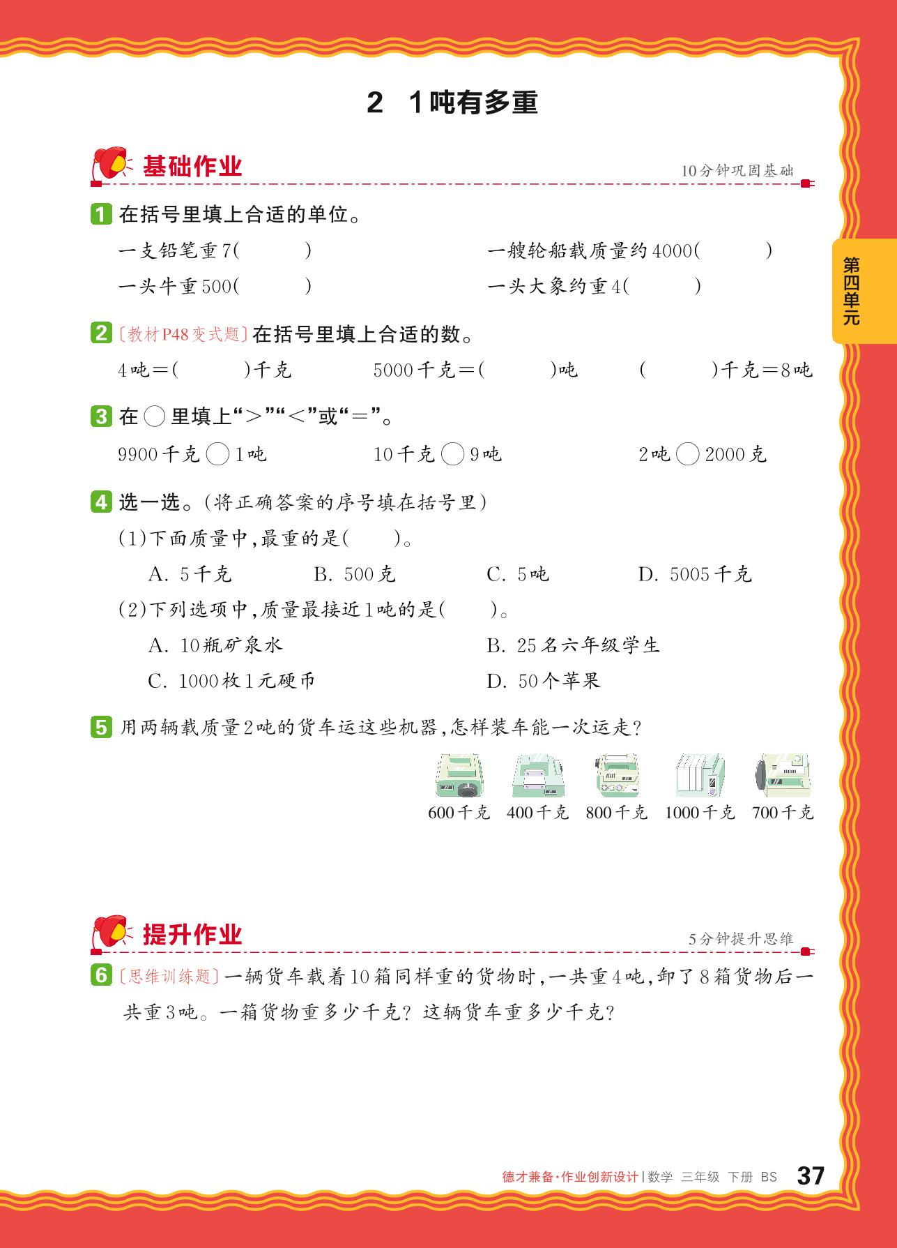 2024春下册三年级数学北师版 第四单元 干克、克、吨——2. 1吨有多重