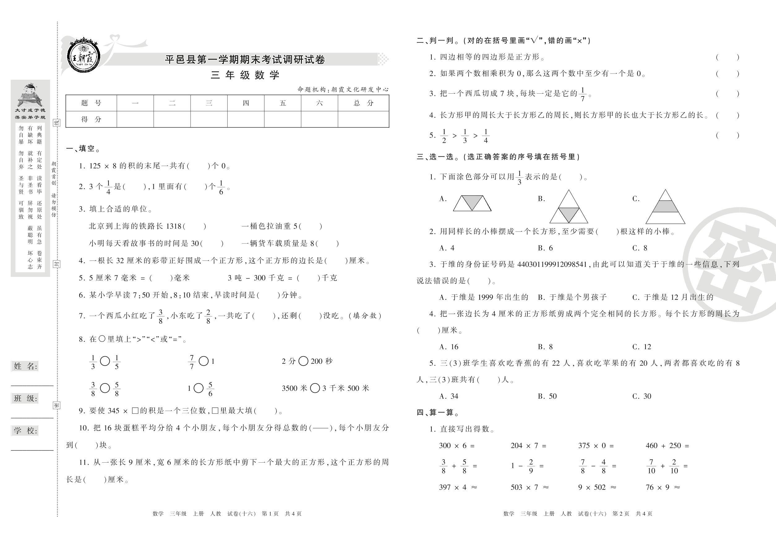 2016-2017学年第一学期临沂市平邑县三年级数学试卷(人教版)【16】