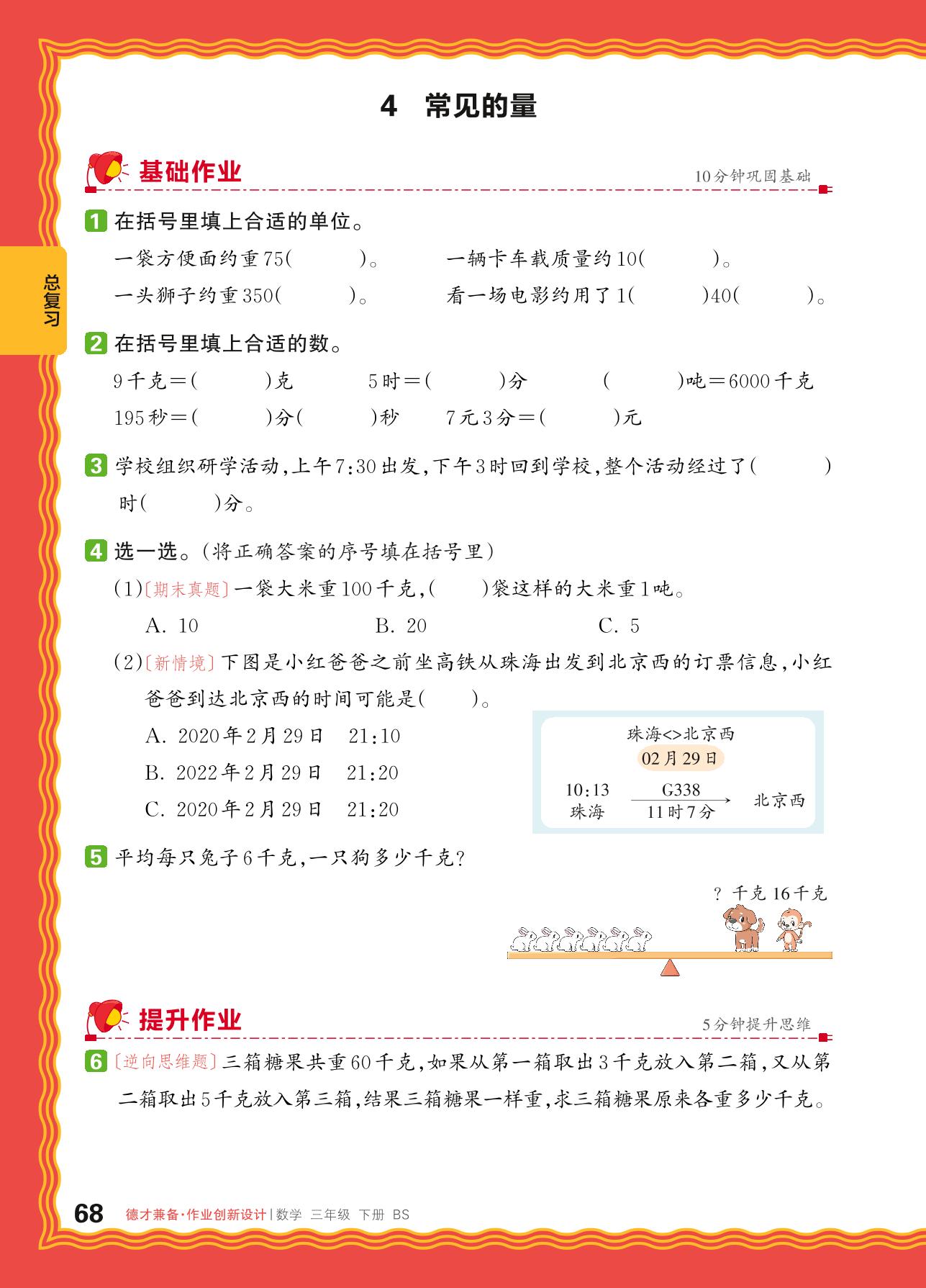 2024春下册三年级数学北师版 总复习——4. 常见的量