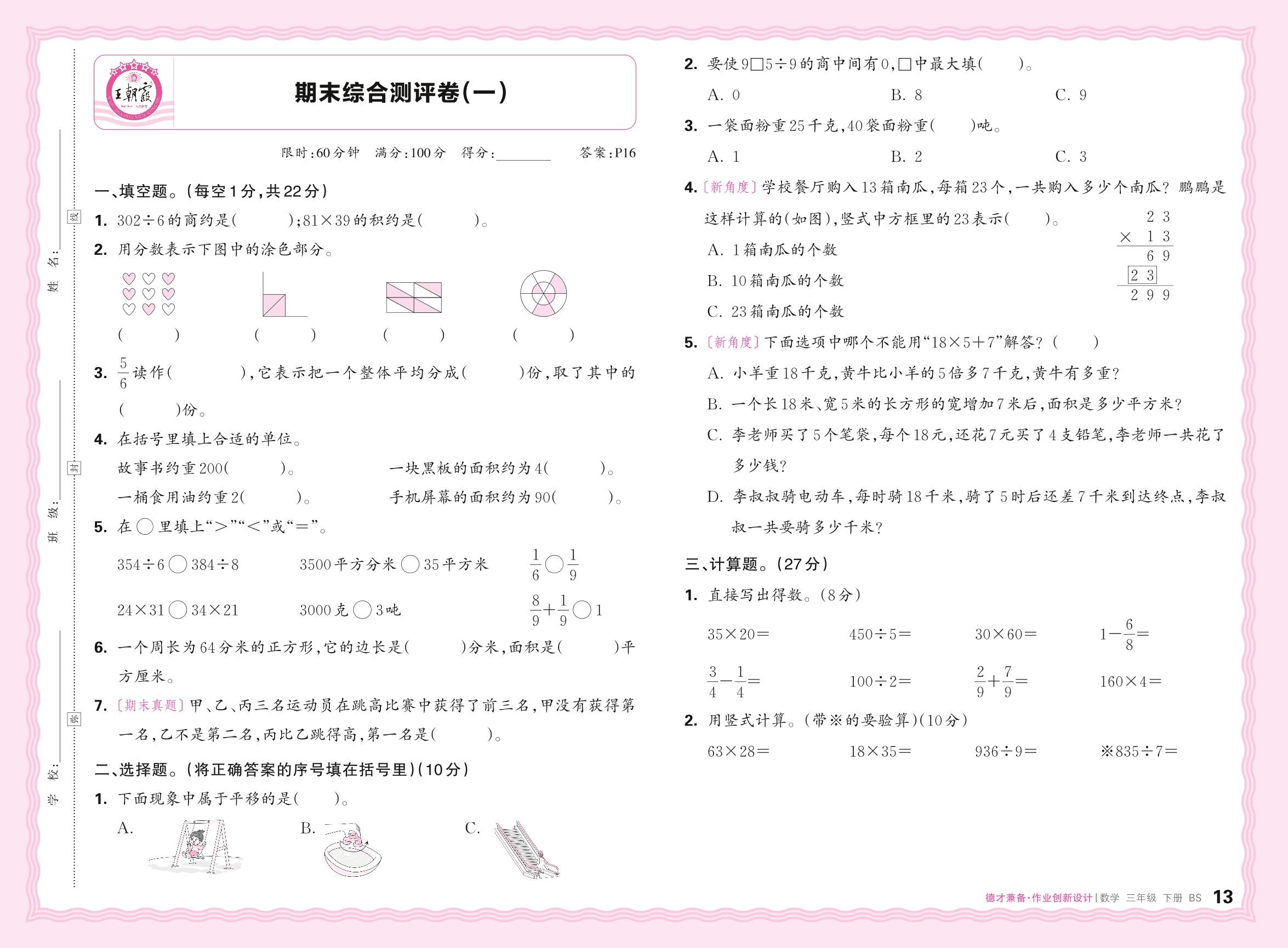 2024春下册三年级数学北师版 期末综合测评卷(一)