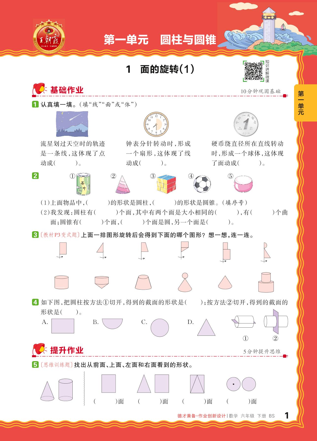 2024春下册六年级数学北师版 第一单元 圆柱与圆锥——1. 面的旅转(1)