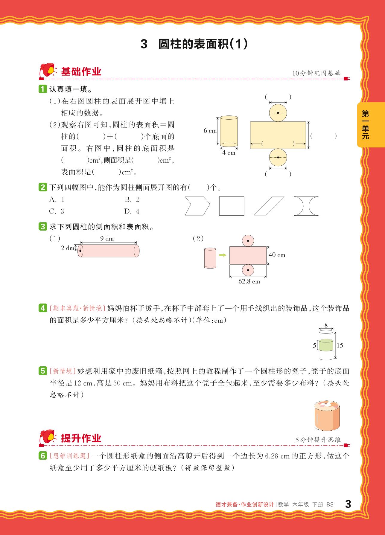 2024春下册六年级数学北师版 第一单元 圆柱与圆锥——3. 圆柱的表面积(1)_R240124095207597