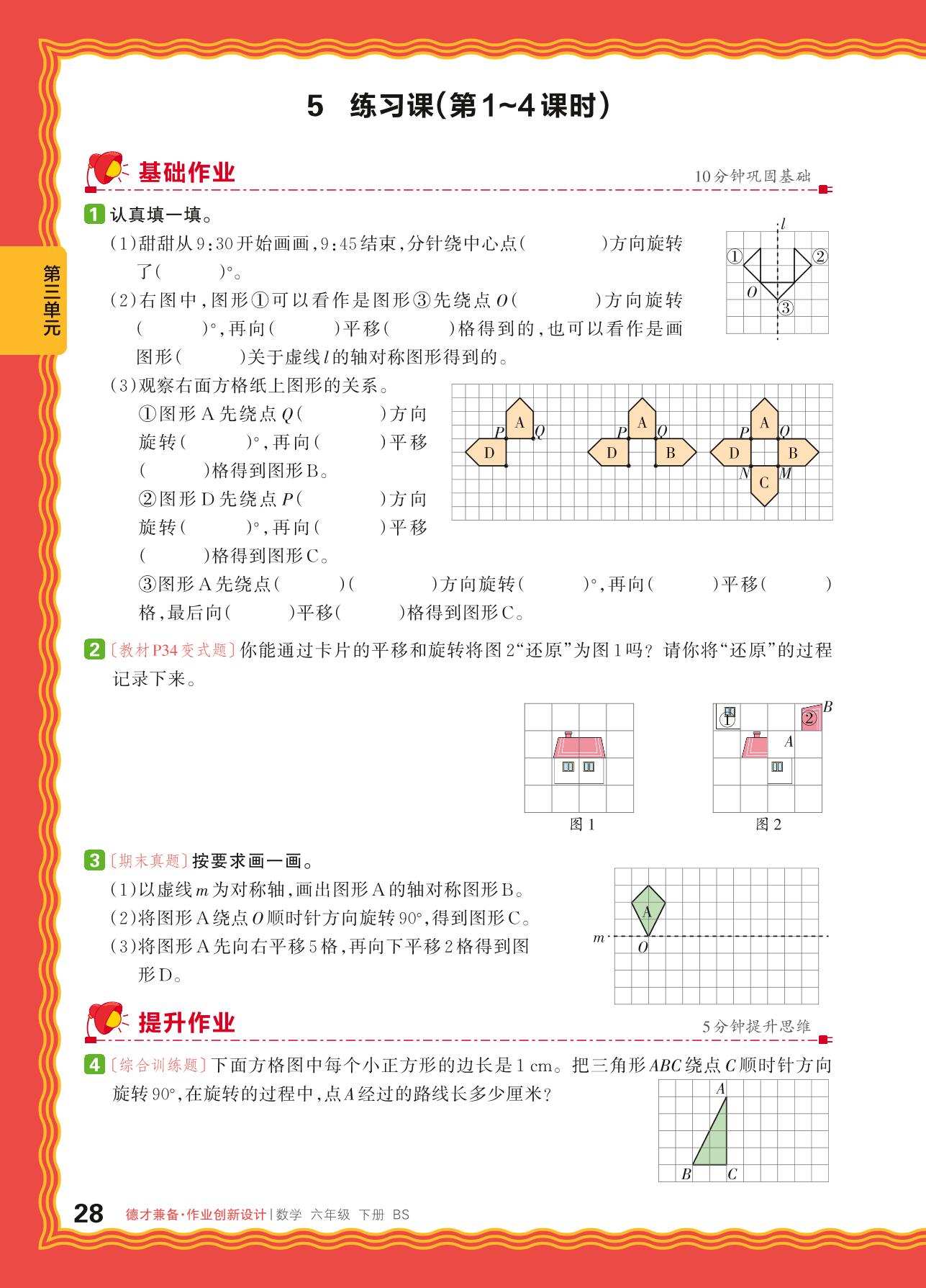 2024春下册六年级数学北师版 第三单元 图形的运动——图形的旋转(一)、图形的旋转(二)、图形的运动练习课