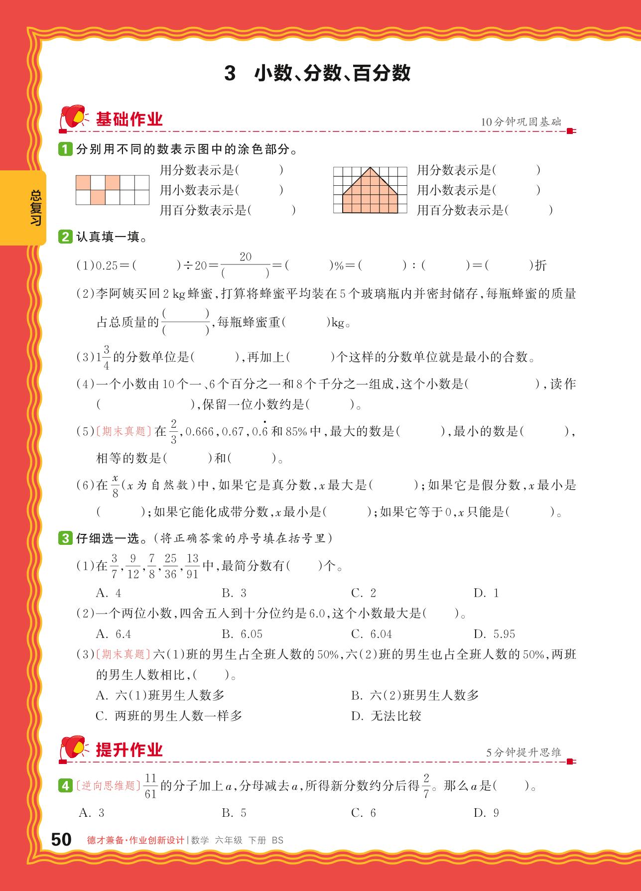 2024春下册六年级数学北师版 总复习 数与代数——3. 小数、分数、百分数