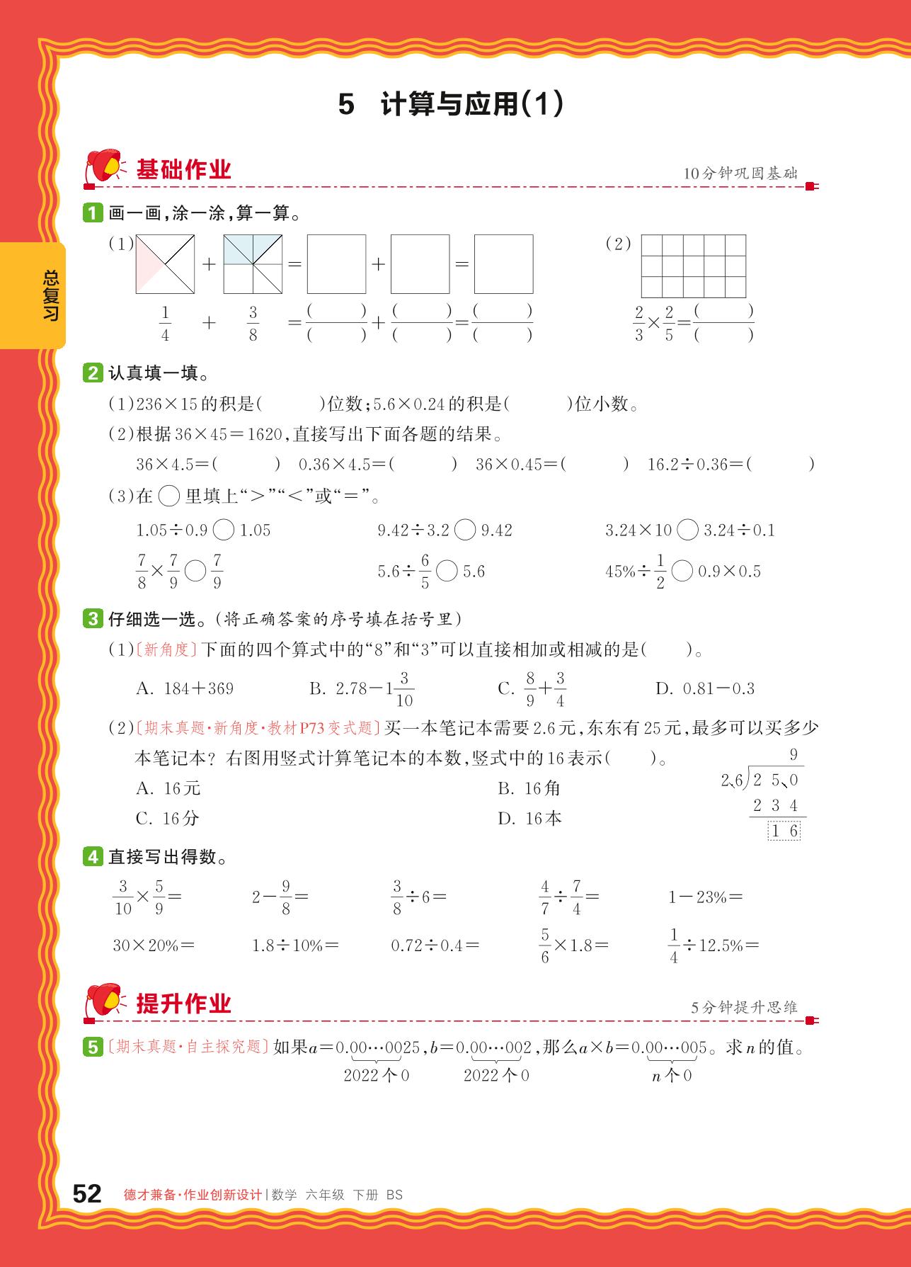 2024春下册六年级数学北师版 总复习 数与代数——5. 计算与应用(1)