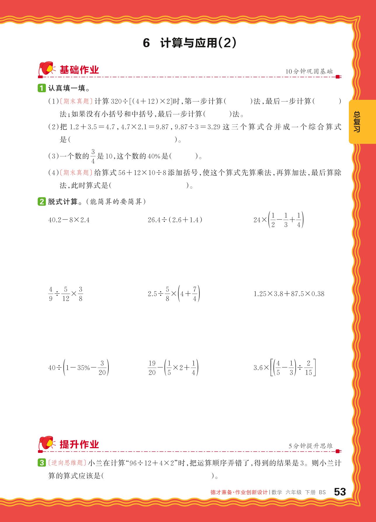 2024春下册六年级数学北师版 总复习 数与代数——6. 计算与应用(2)