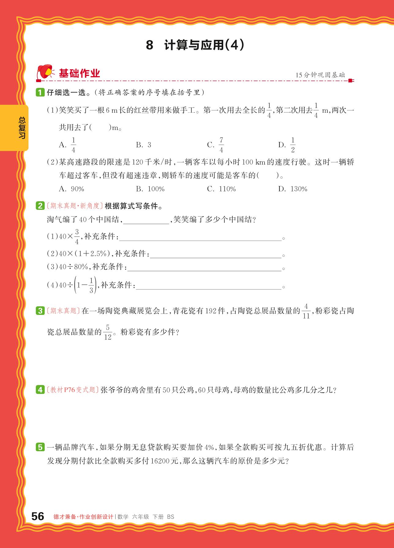 2024春下册六年级数学北师版 总复习 数与代数——8. 计算与应用(4)