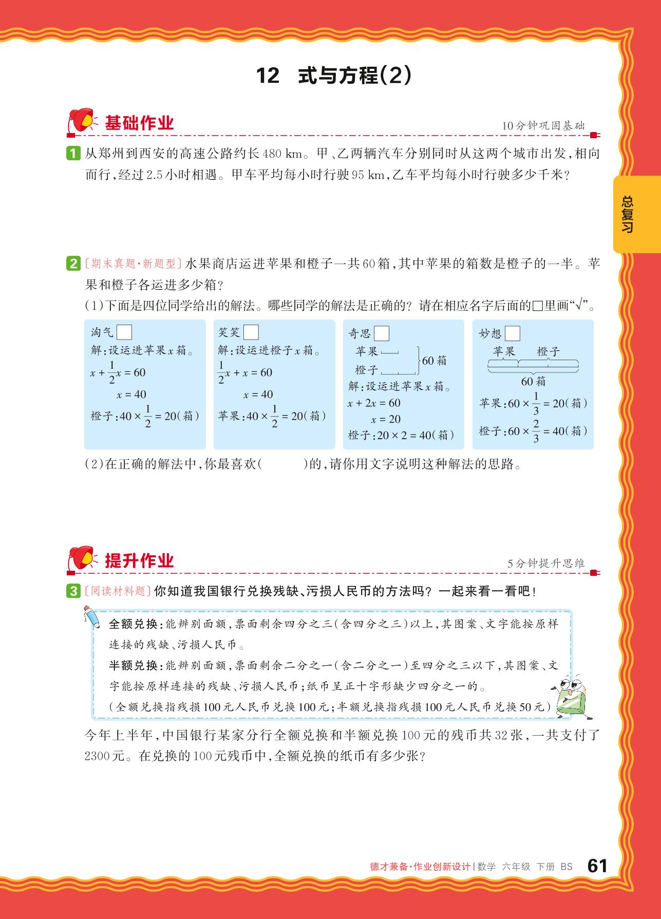 2024春下册六年级数学北师版 总复习 数与代数——12. 式与方程(2)
