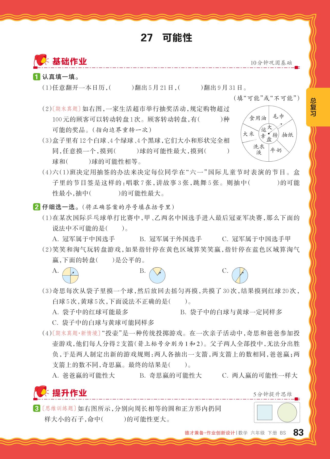 2024春下册六年级数学北师版 总复习 统计与概率——27. 可能性