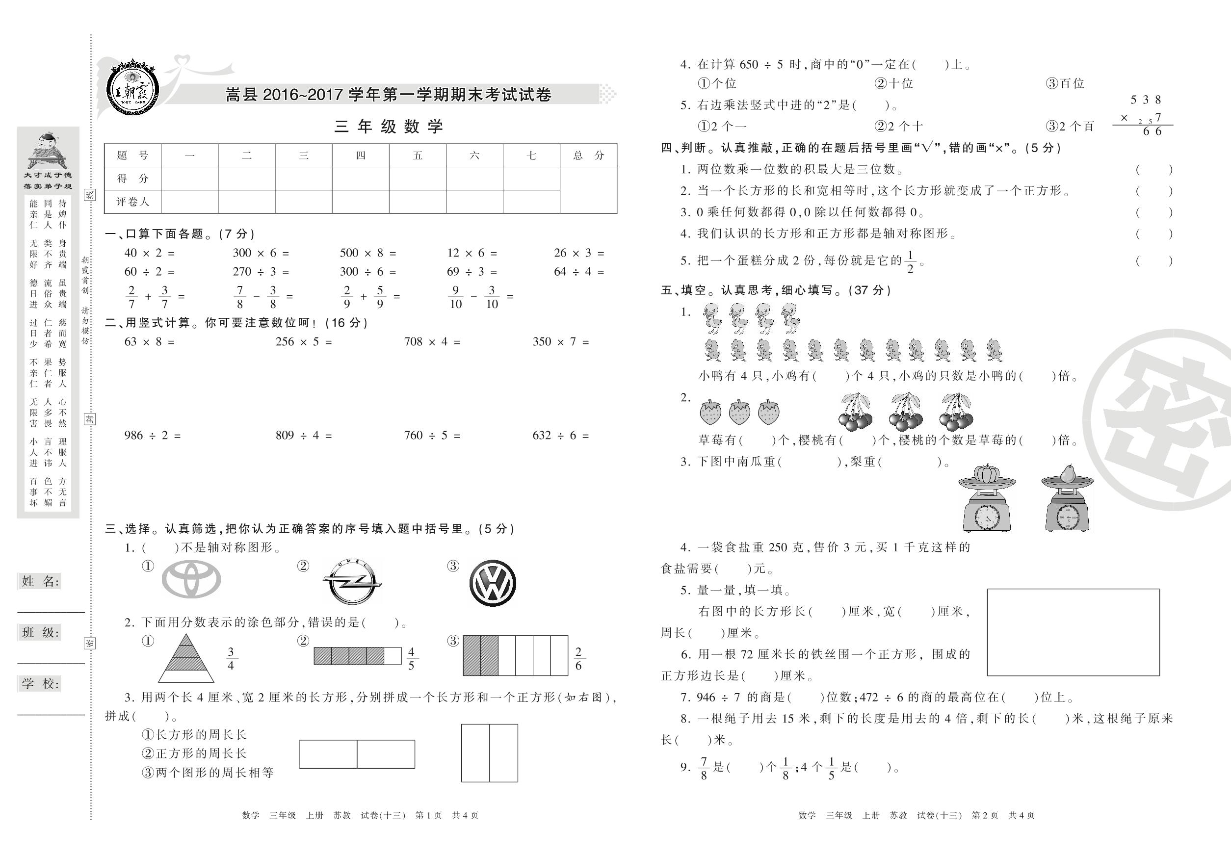 2016-2017学年第一学期洛阳市嵩县三年级数学试卷(苏教版)【13】