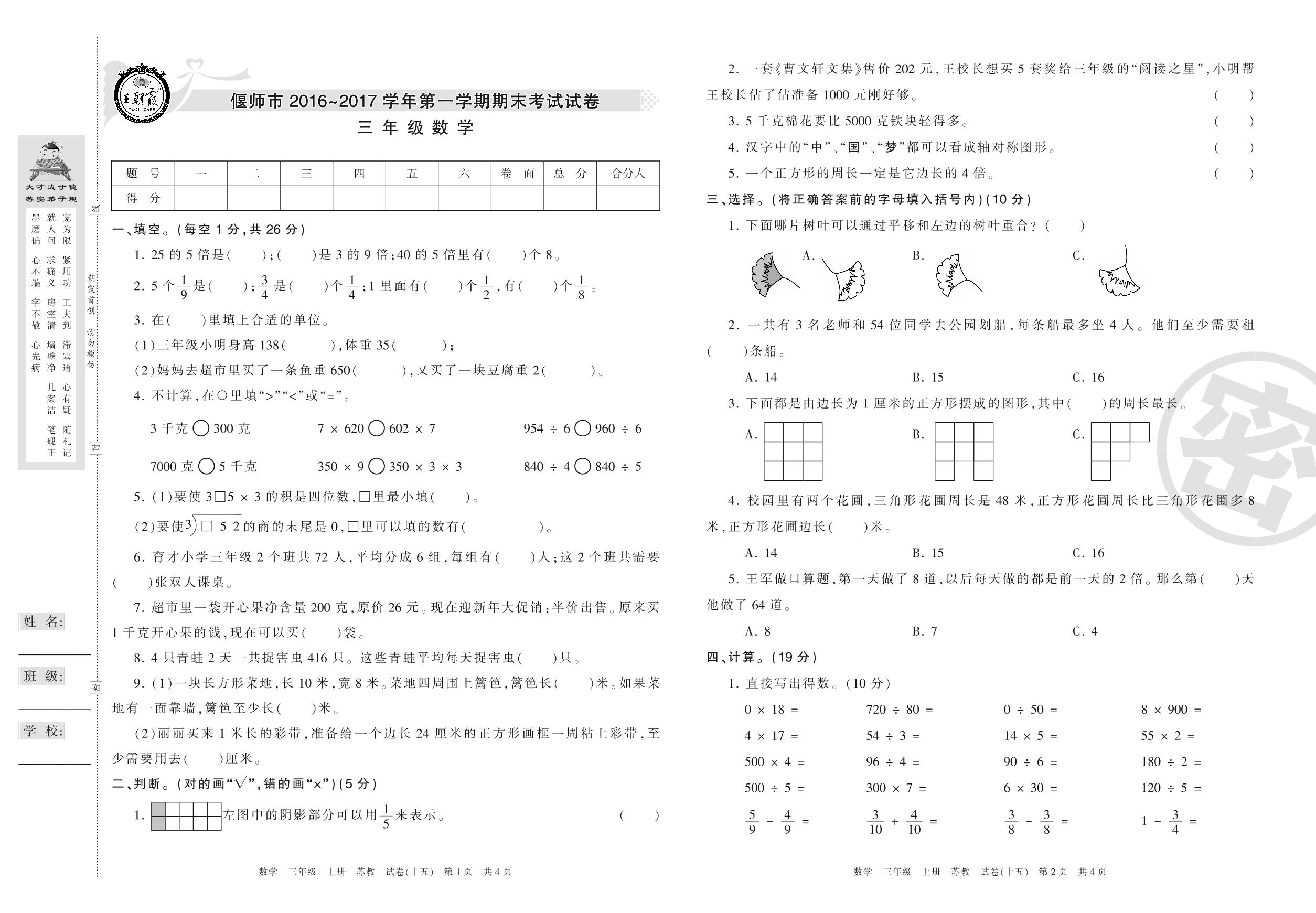 2016-2017学年第一学期偃师市三年级数学试卷(苏教版)【15】