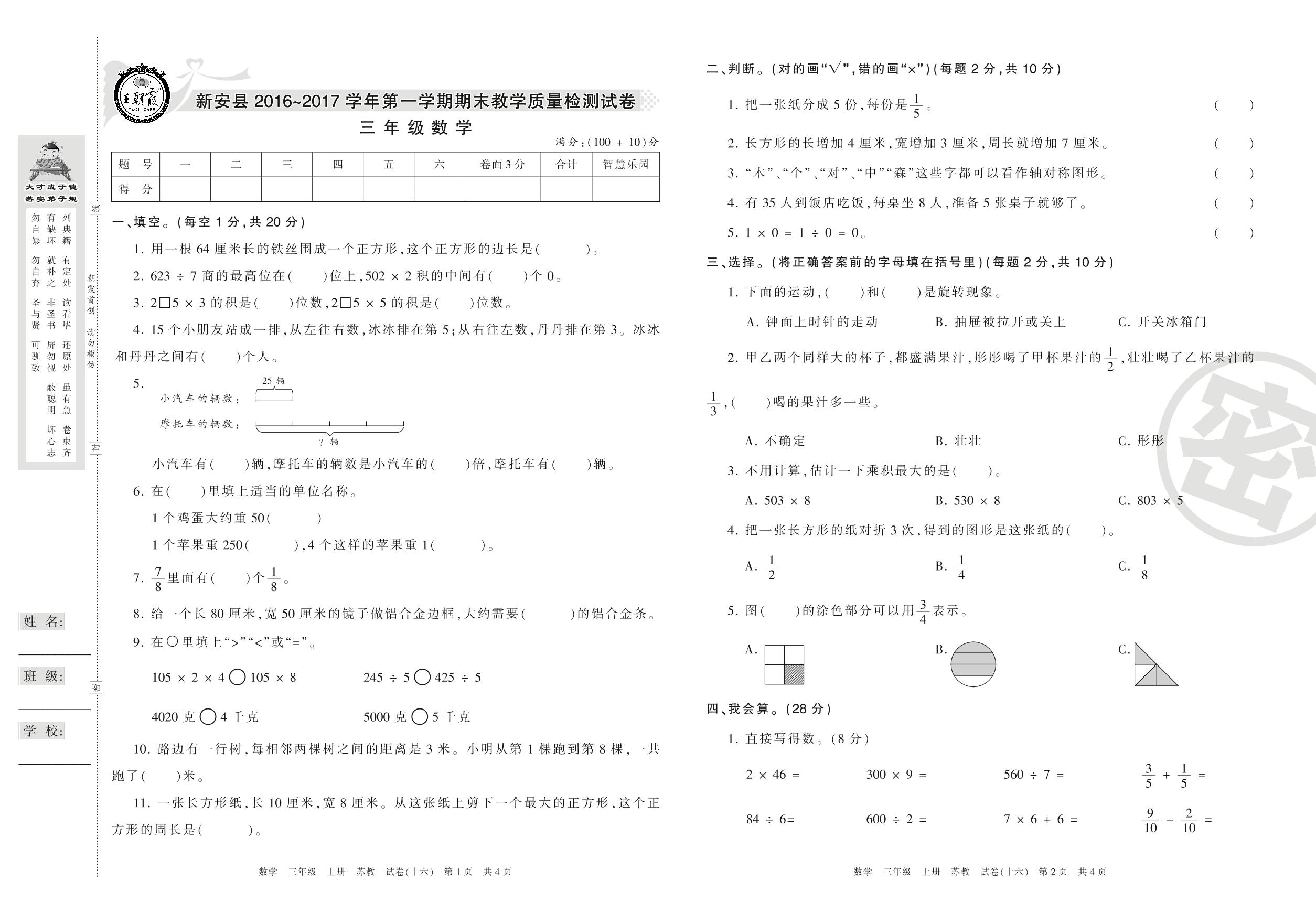 2016-2017学年第一学期洛阳市新安县三年级数学试卷(苏教版)【16】
