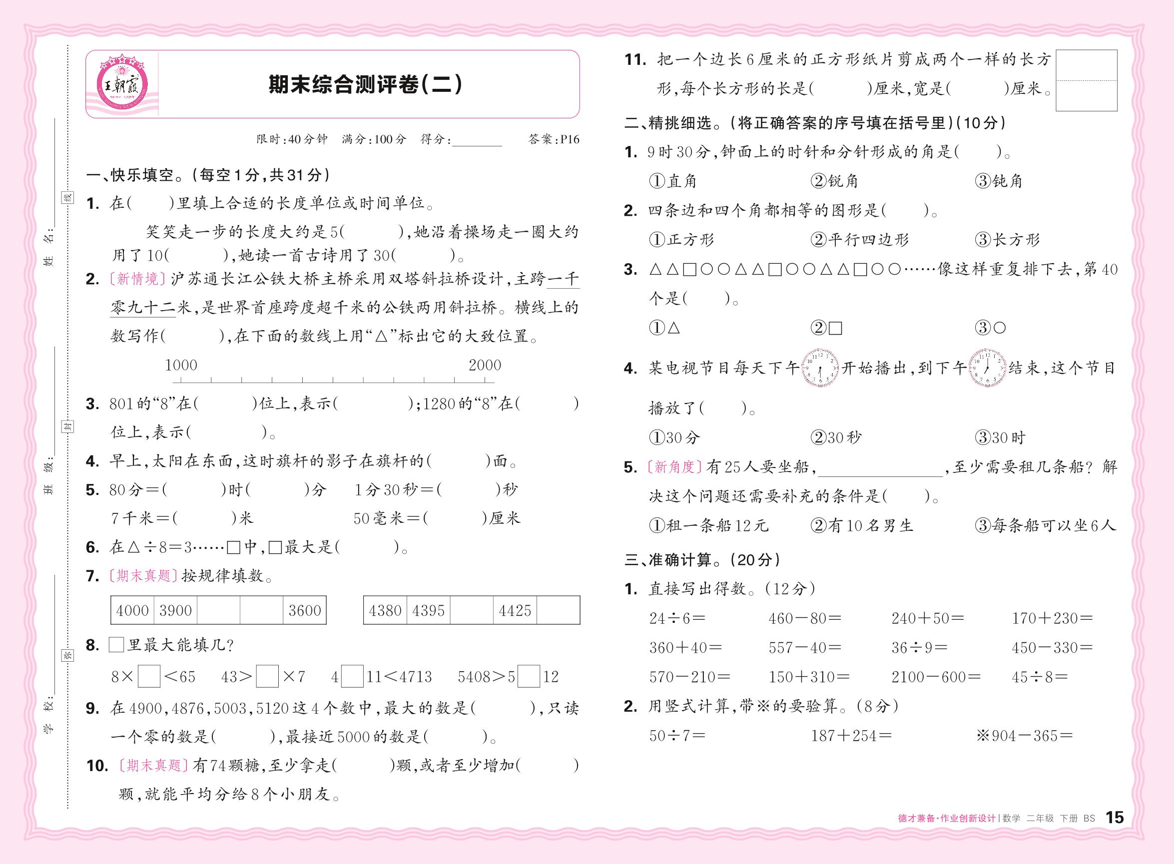 2024春下册二年级数学北师版 期末综合测评卷(二)