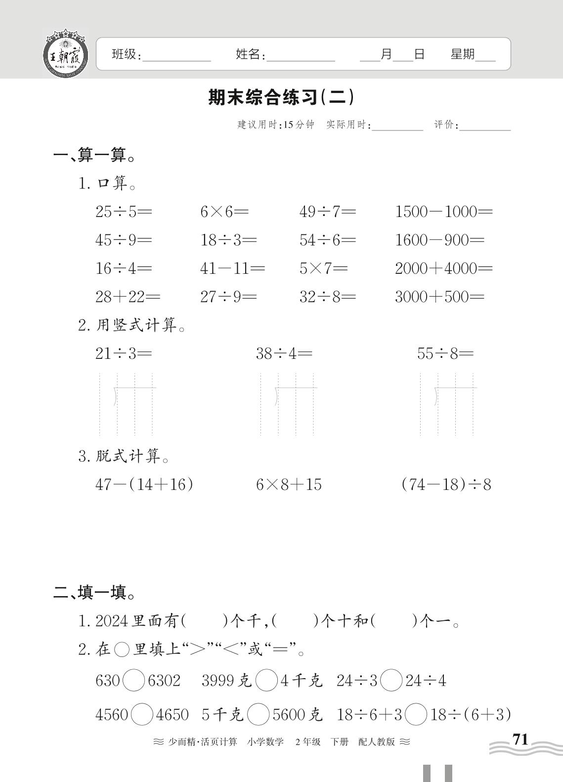2024春下册二年级数学人教版 期末综合练习(二)(计算专练)
