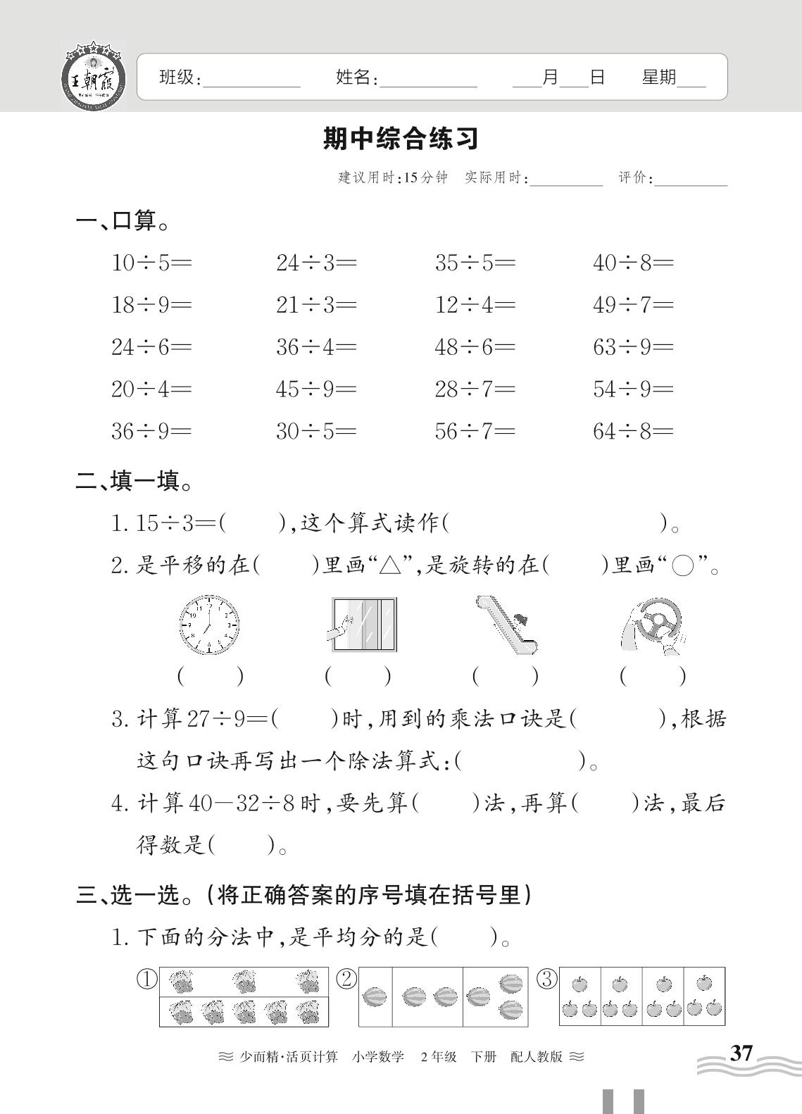 二年级数学人教版下册期中卷