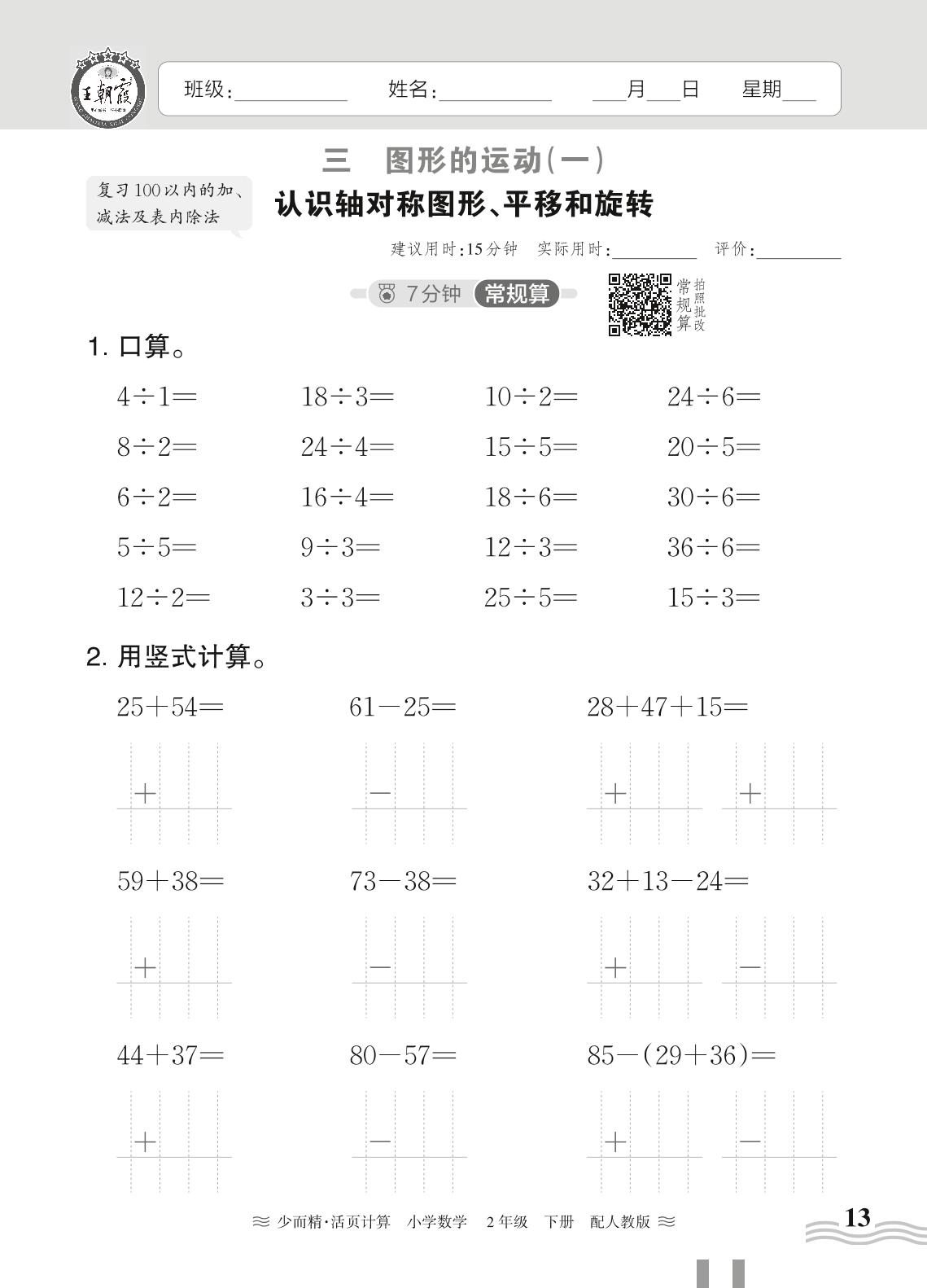 2024春下册二年级数学人教版 第三单元 图形的运动(一)——认识轴对称图形、平移和旋转
