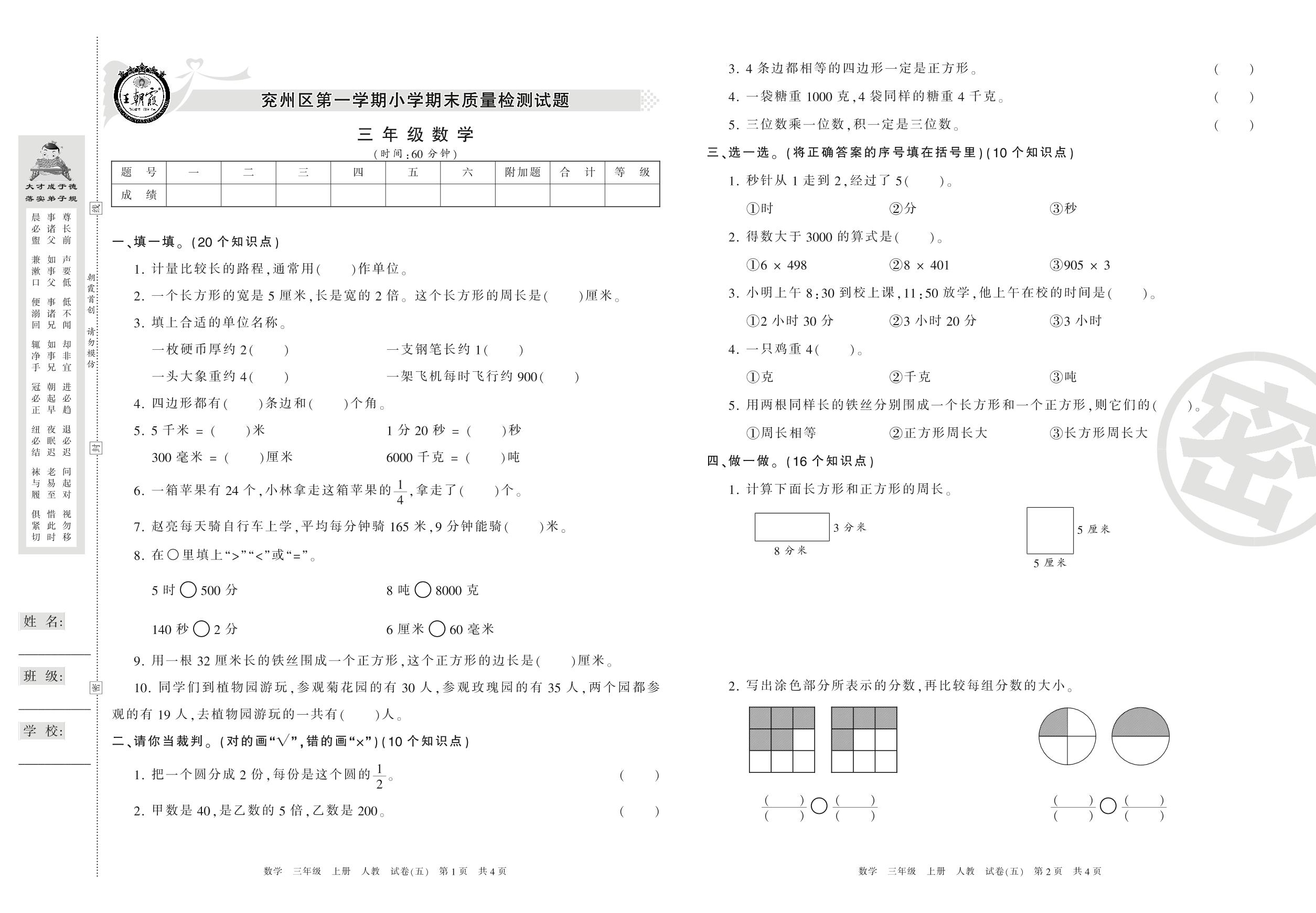 2016-2017学年第一学期济宁市兖州区三年级数学试卷(人教版)【5】