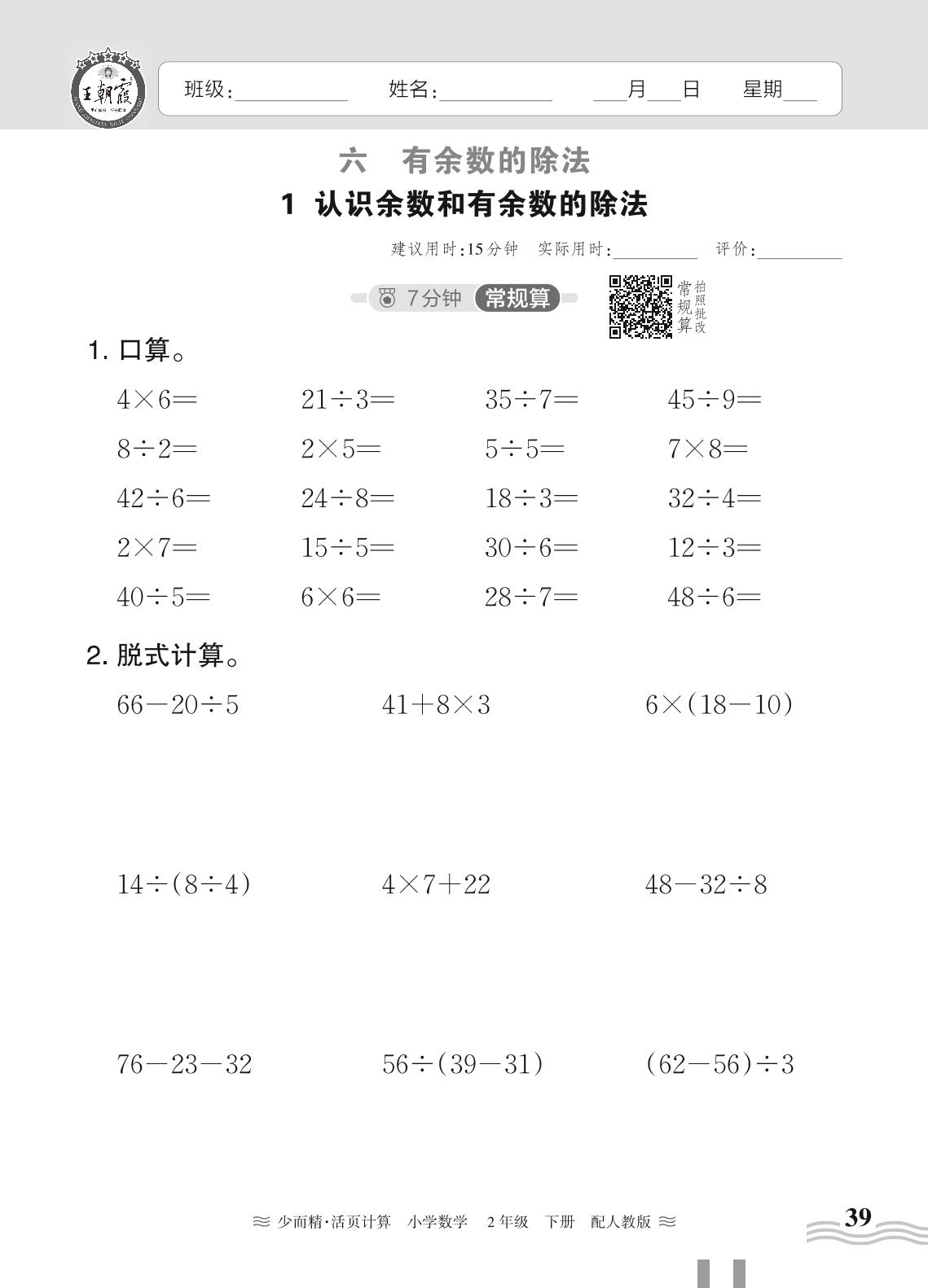 2024春下册二年级数学人教版 第六单元 有余数的除法——1. 认识余数和有余数的除法