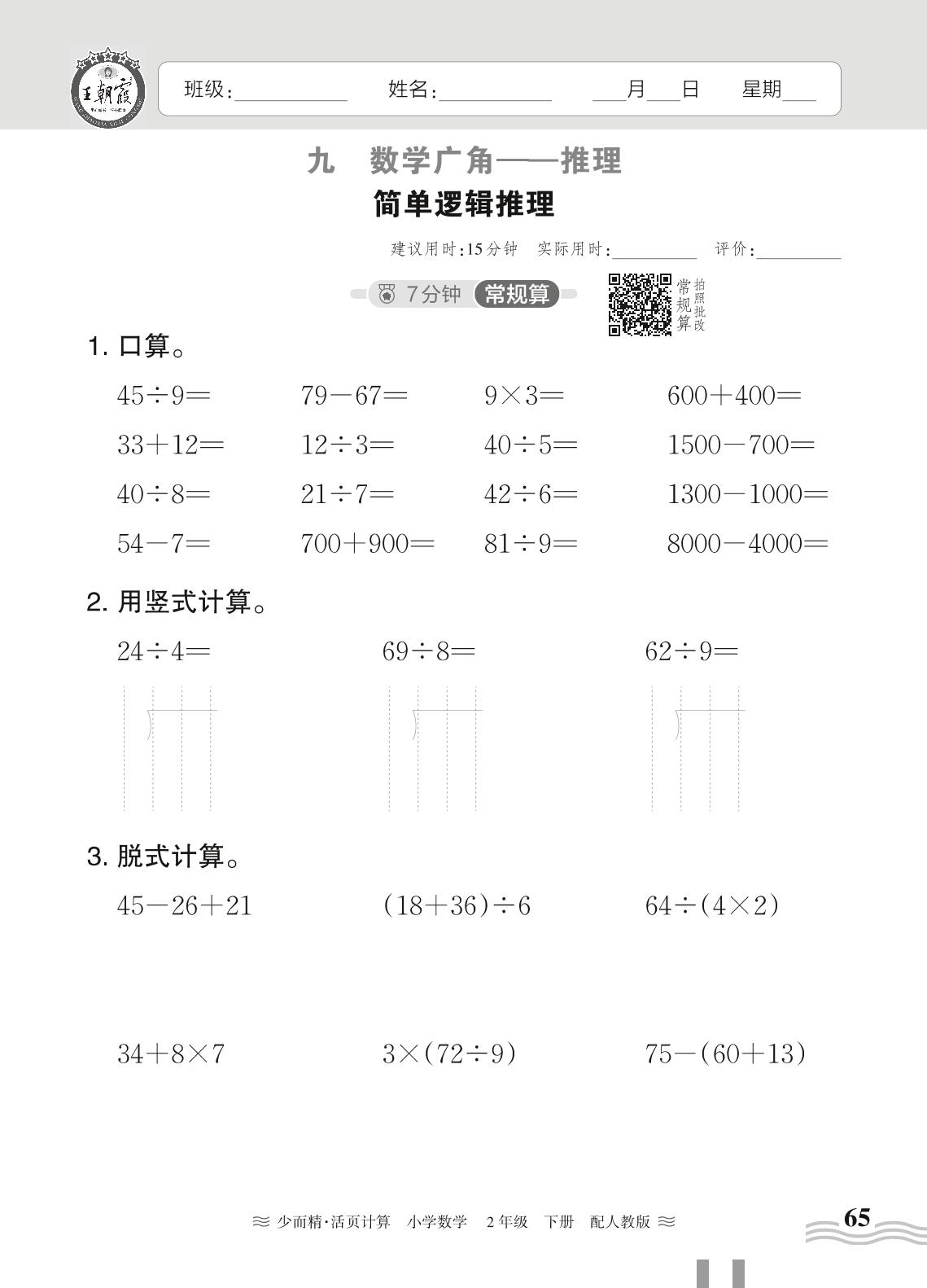 2024春下册二年级数学人教版 第九单元 数学广角 推理——简单逻辑推理