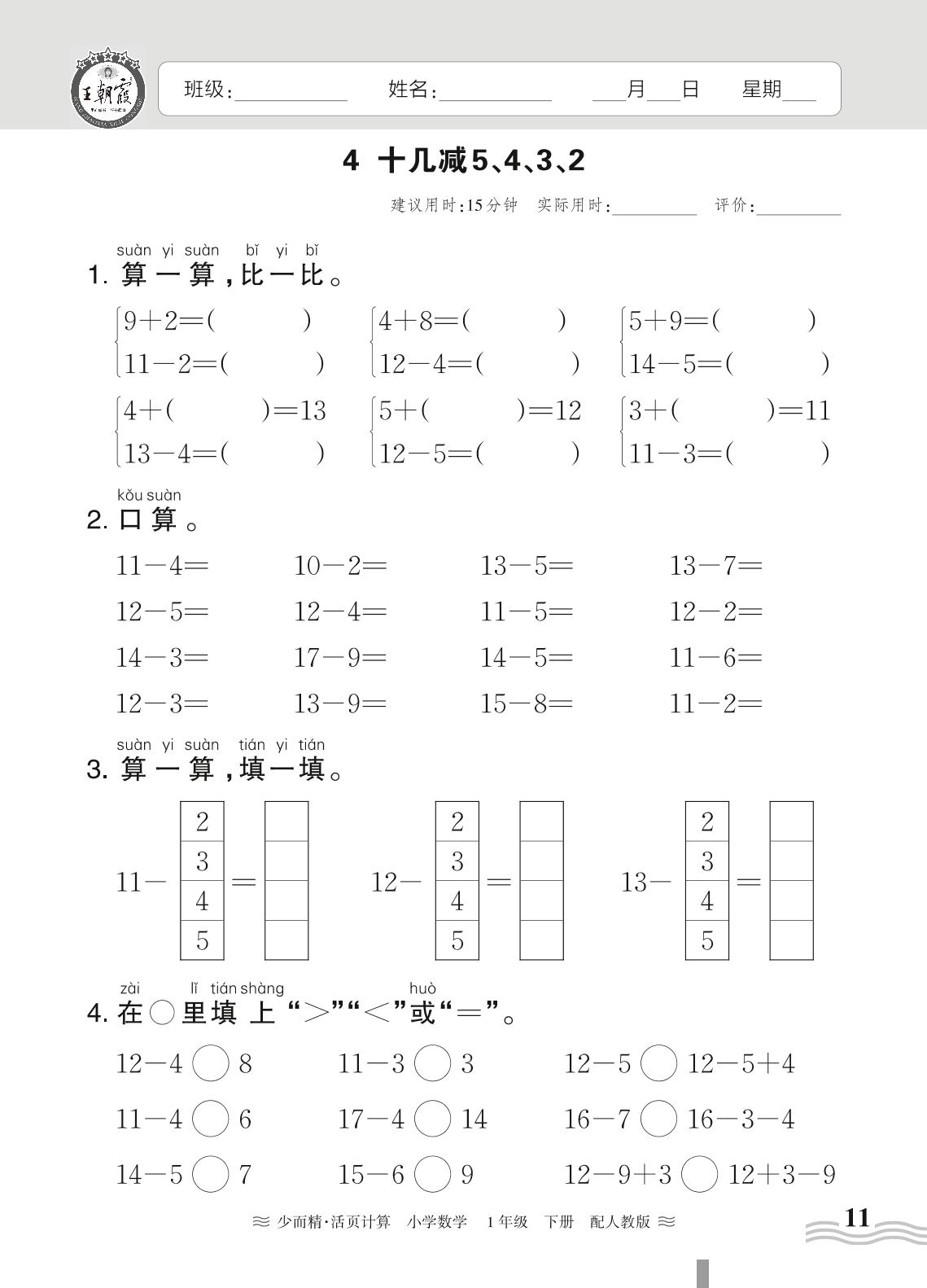 2024春下册一年级数学人教版 第二单元 20以内的退位减法——4. 十几减5、4、3、2