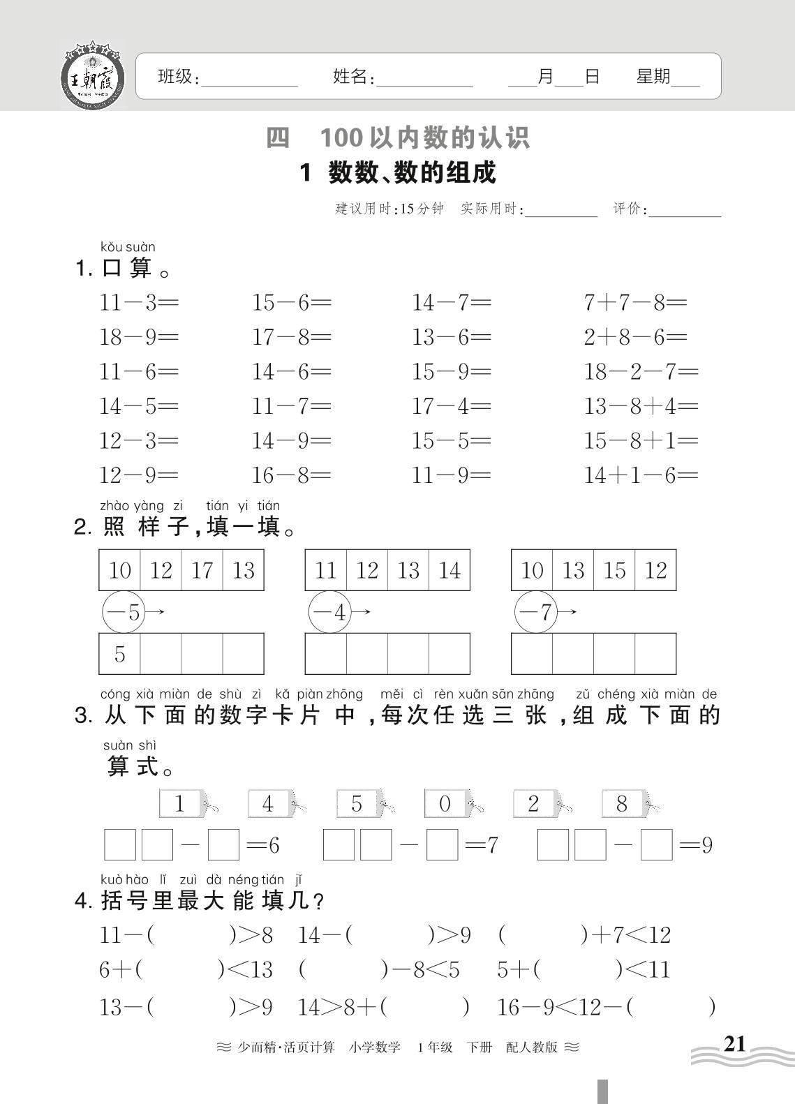 2024春下册一年级数学人教版 第四单元 100以内数的认识——1. 数数、数的组成