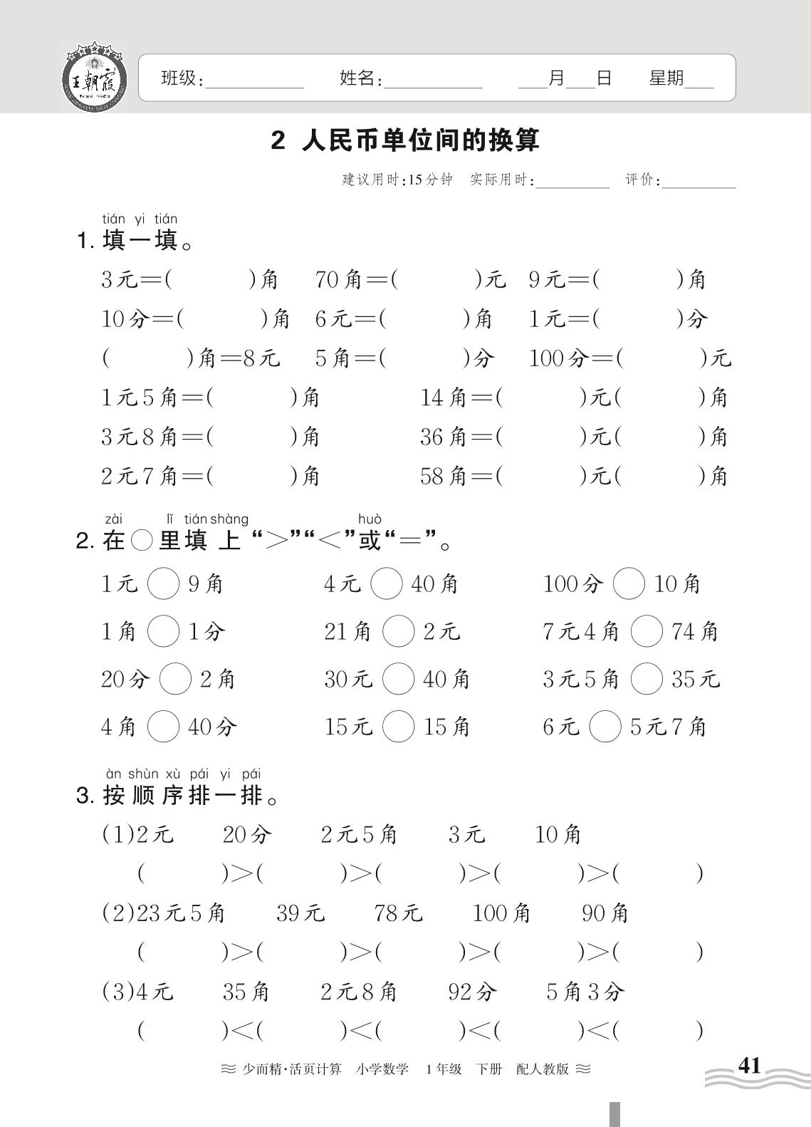 2024春下册一年级数学人教版 第五单元 认识人民币——2. 人民币单位间的换算