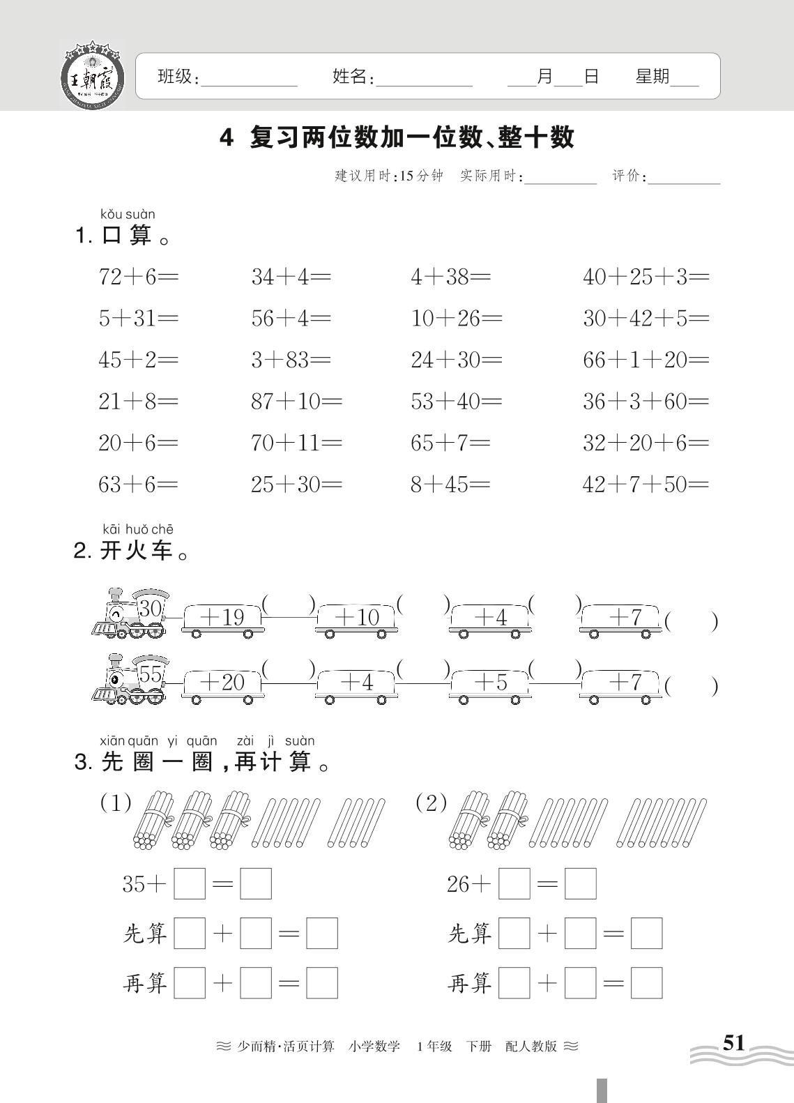 2024春下册一年级数学人教版 第六单元 100以内的加法和减法(一)——4. 复习两位数加一位数、整十数
