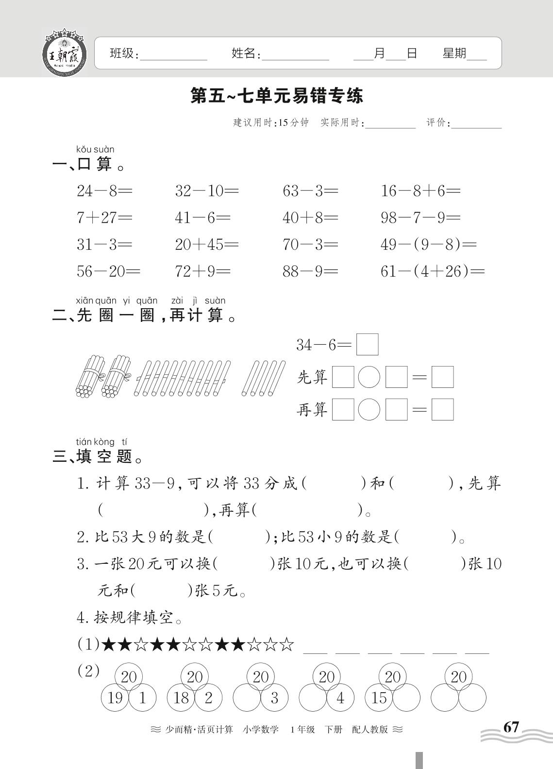 2024春下册一年级数学人教版 第五~七单元易错专练