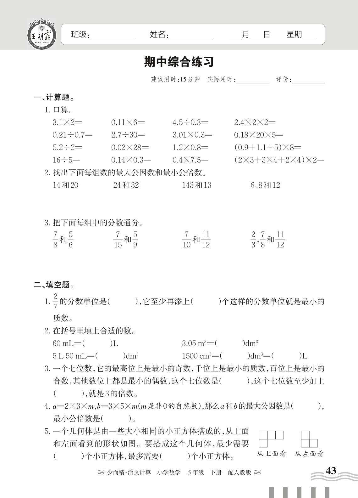 2024春下册五年级数学人教版 期中综合练习(计算专练)