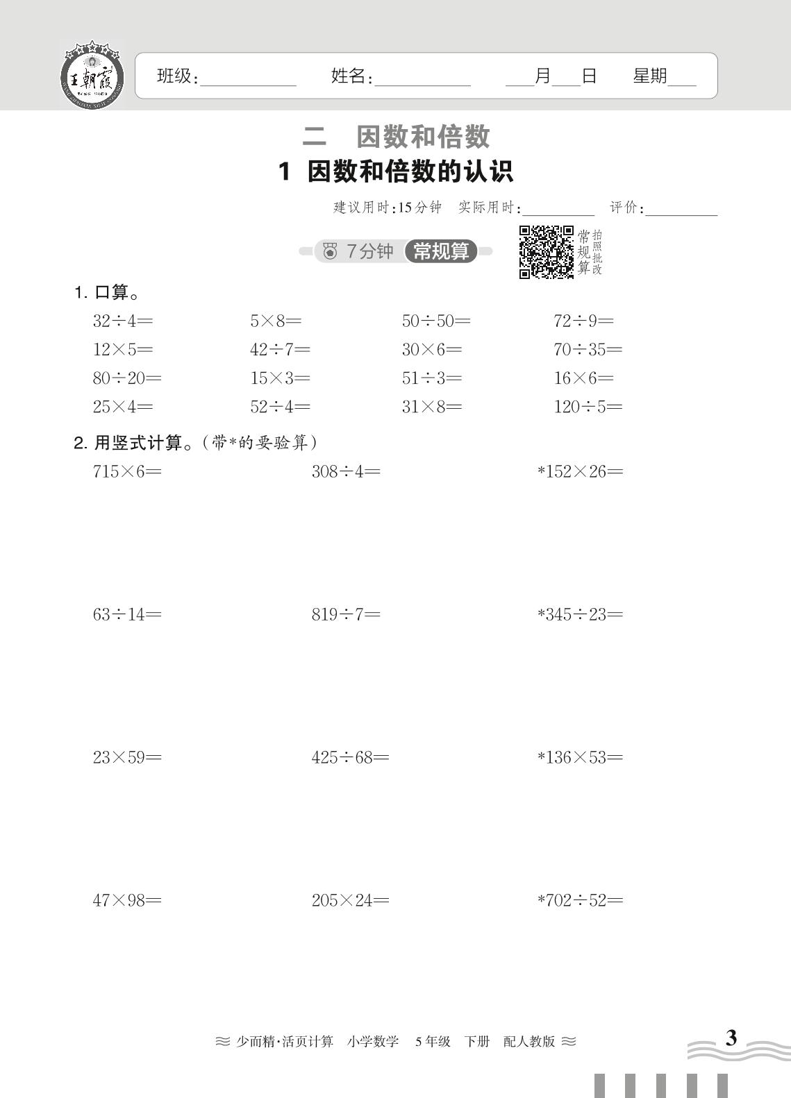 2024春下册五年级数学人教版 第二单元 因数和倍数——1. 因数和倍数的认识