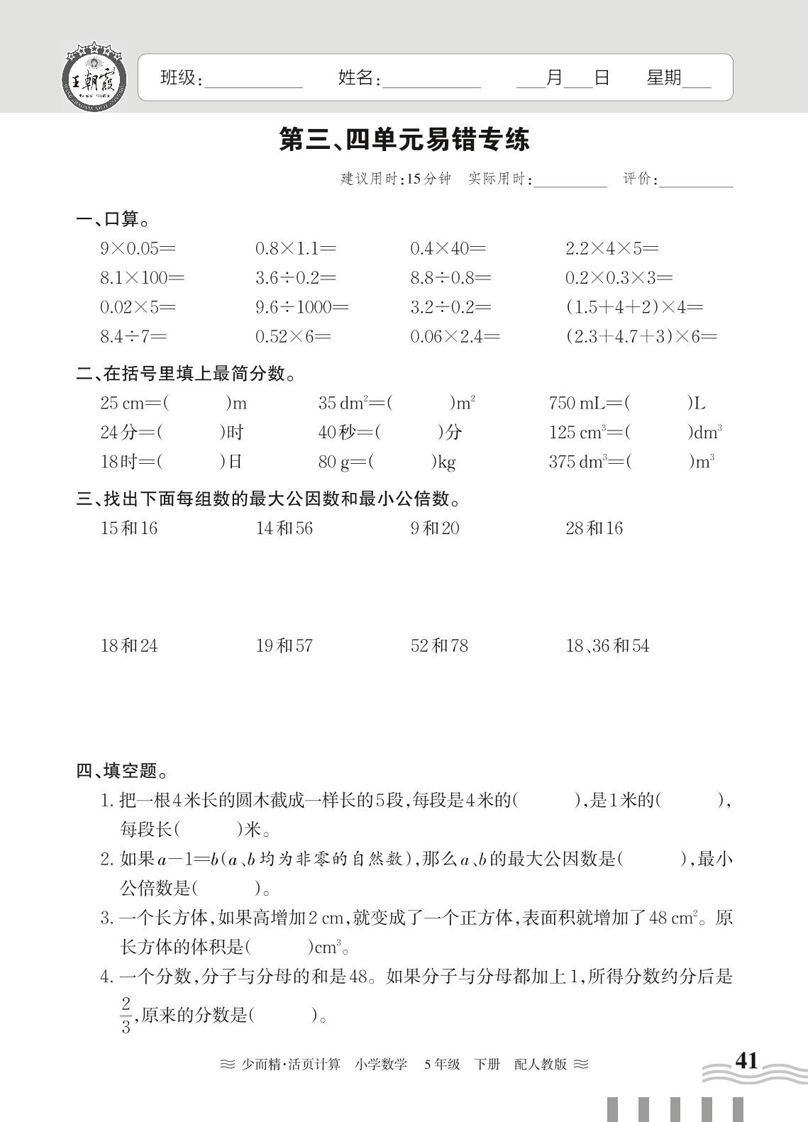 2024春下册五年级数学人教版 第三、四单元易错专练
