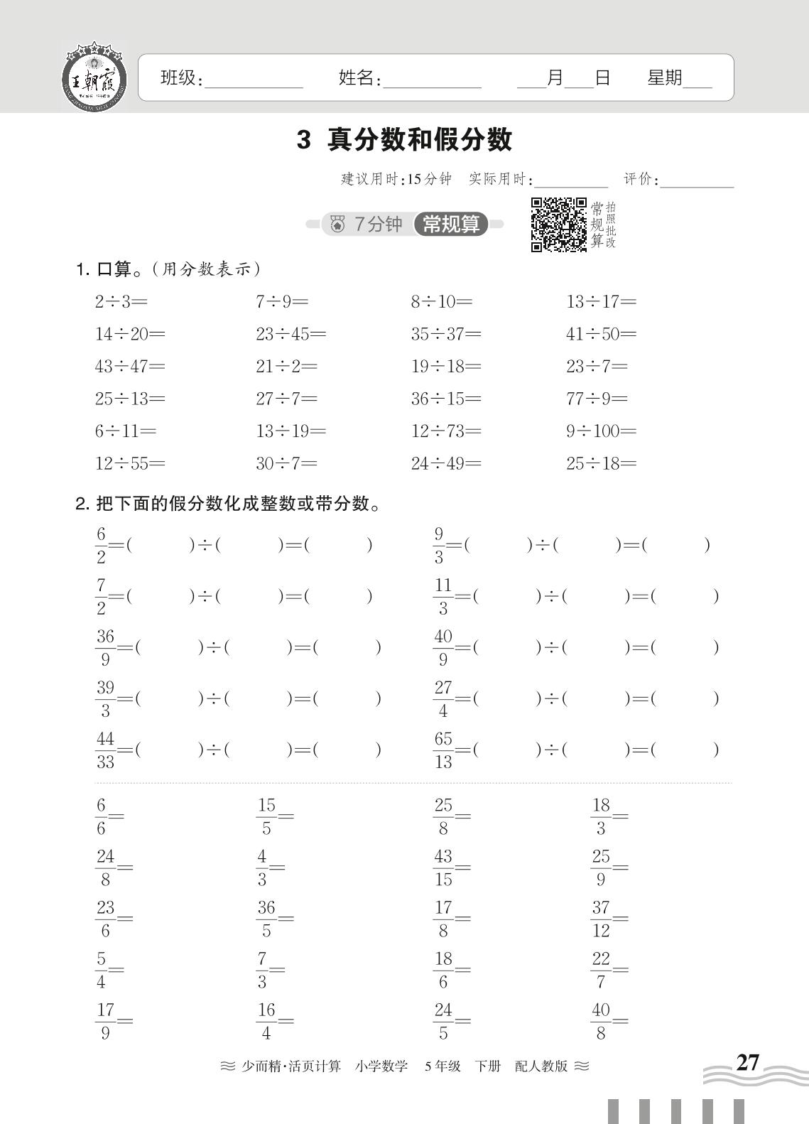 2024春下册五年级数学人教版 第四单元 分数的意义和性质——3. 真分数和假分数