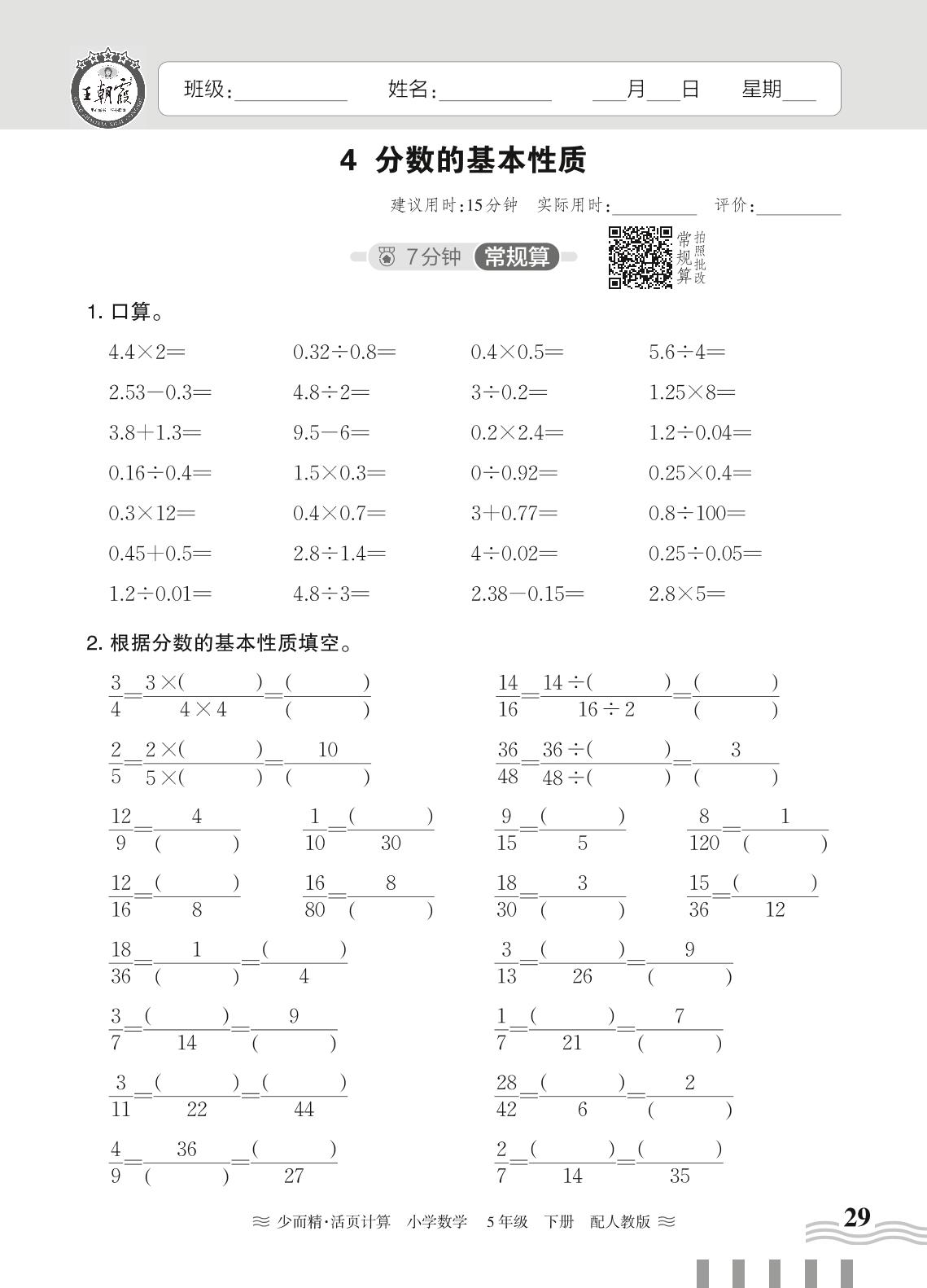 2024春下册五年级数学人教版 第四单元 分数的意义和性质——4. 分数的基本性质