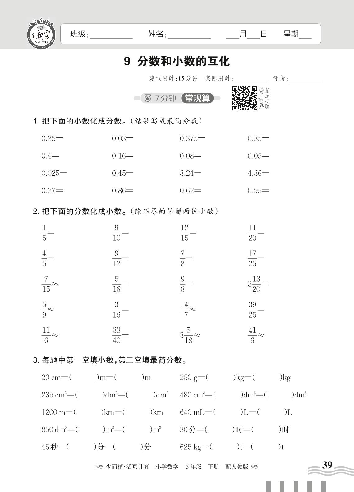 2024春下册五年级数学人教版 第四单元 分数的意义和性质——9. 分数和小数的互化