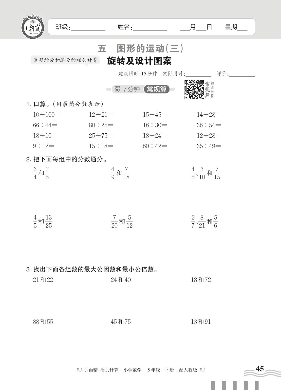 2024春下册五年级数学人教版 第五单元 图形的运动(三)——旋转及设计图案