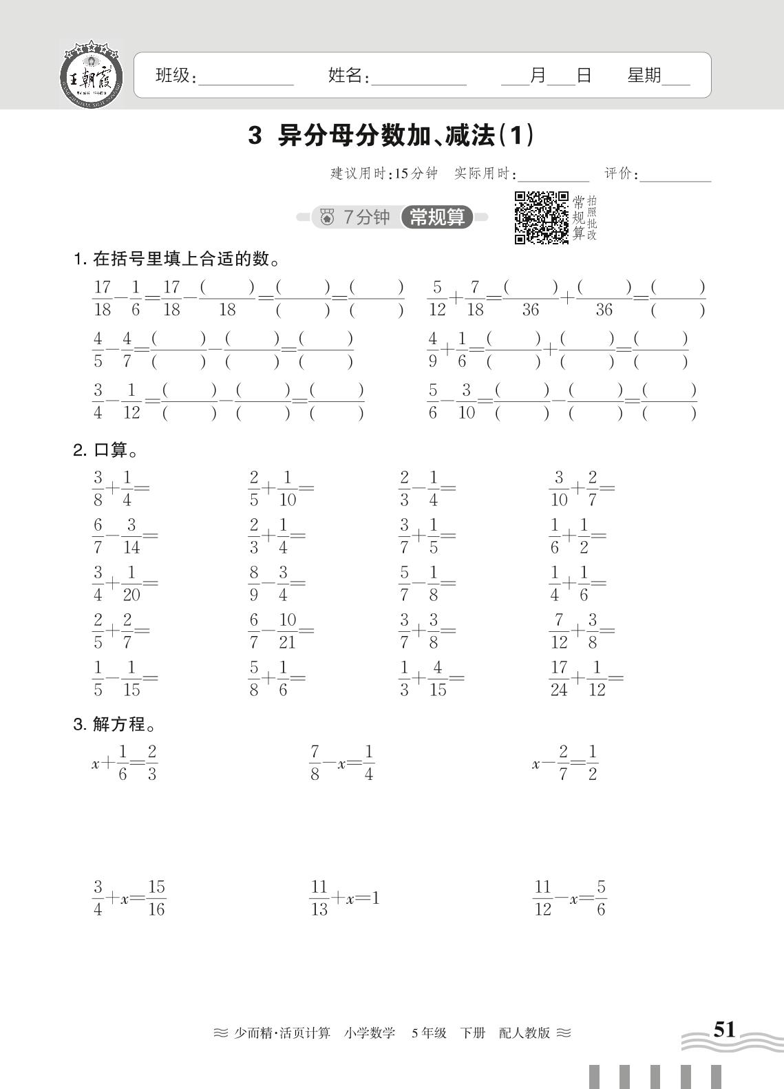 2024春下册五年级数学人教版 第六单元 分数的加法和减法——3. 异分母分数加、减法(1)_R240124110833351