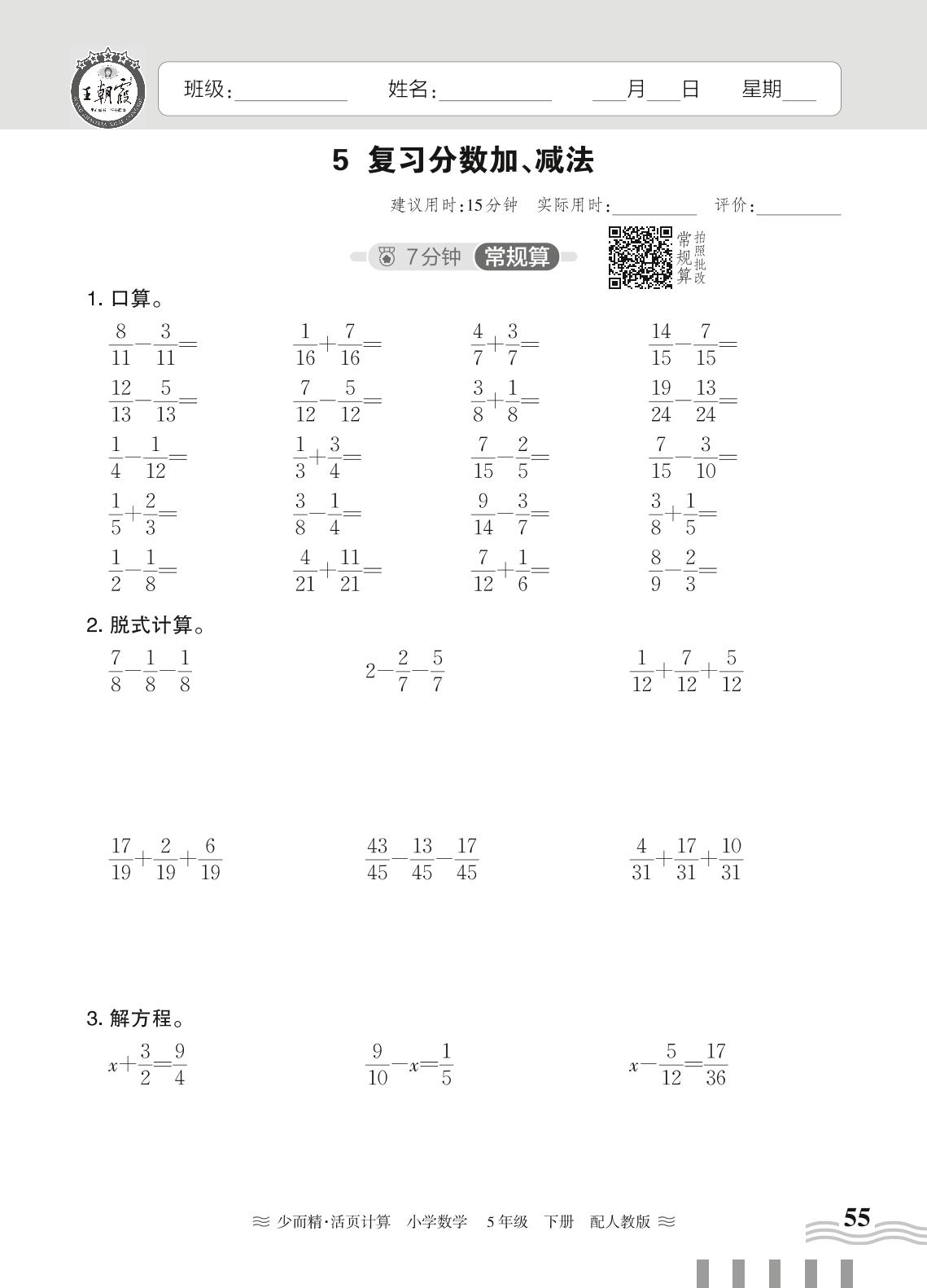2024春下册五年级数学人教版 第六单元 分数的加法和减法——5. 复习分数加、减法