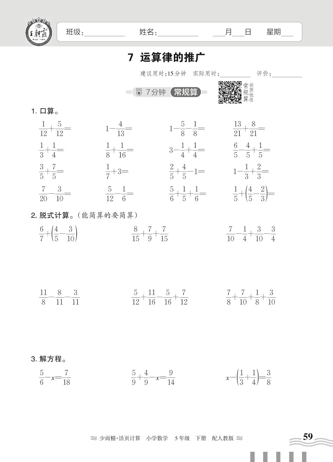 2024春下册五年级数学人教版 第六单元 分数的加法和减法——7. 运算律的推广