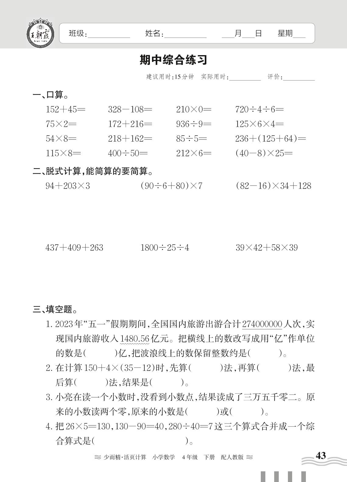 2024春下册四年级数学人教版 期中综合练习(计算专练)