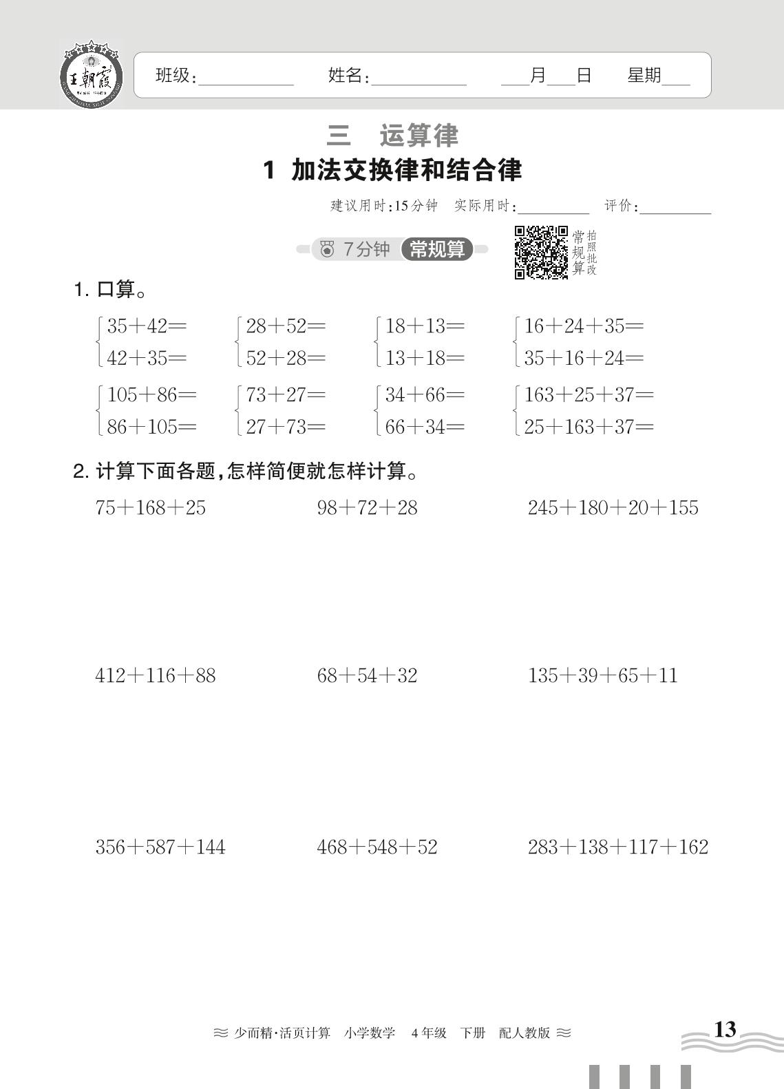 2024春下册四年级数学人教版 第三单元 运算律——1. 加法交换律和结合律_R240124111812044